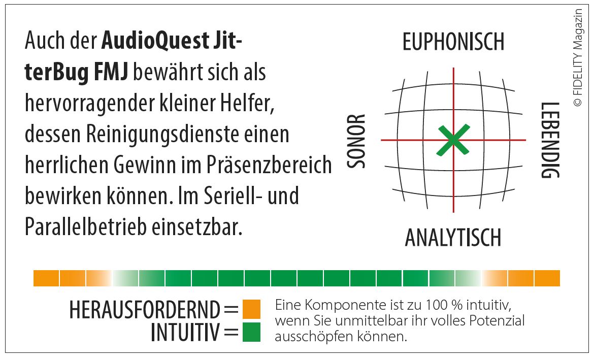 Wer aus nachvollziehbaren Gründen Fan von AudioQuests USB-DACs DragonFly ist, wird seinen Black oder Red mit dem Jitterbug FMJ in Reihenschaltung verbinden. Wer den immer noch besten, schlichtweg grandiosen Cobalt besitzt, kann das auch tun. Er kann es aber auch lassen. Der Cobalt ist bereits mit einer identischen Schmutzableitungsschaltung ausgestattet. Eine hörbare Verbesserung kann das Einstöpseln in den Jitterbug FMJ daher nicht bewirken, gegebenenfalls kommt es sogar zu einer Klangverschlechterung. Dagegen ist der Parallelbetrieb ausdrücklich empfohlen.