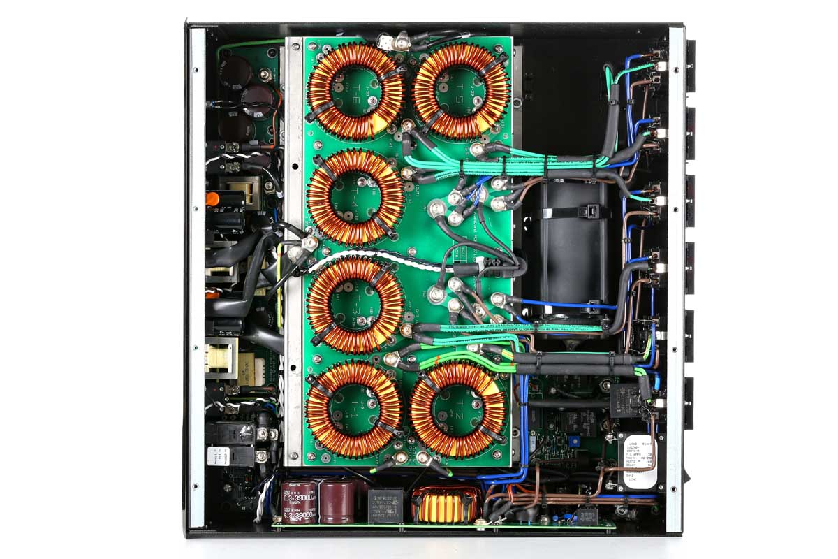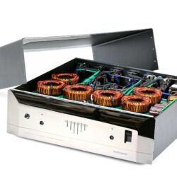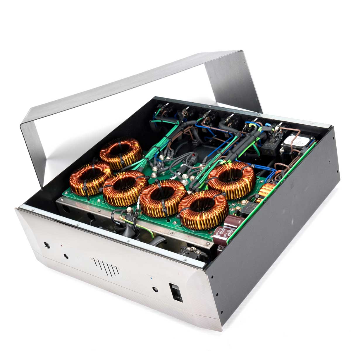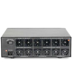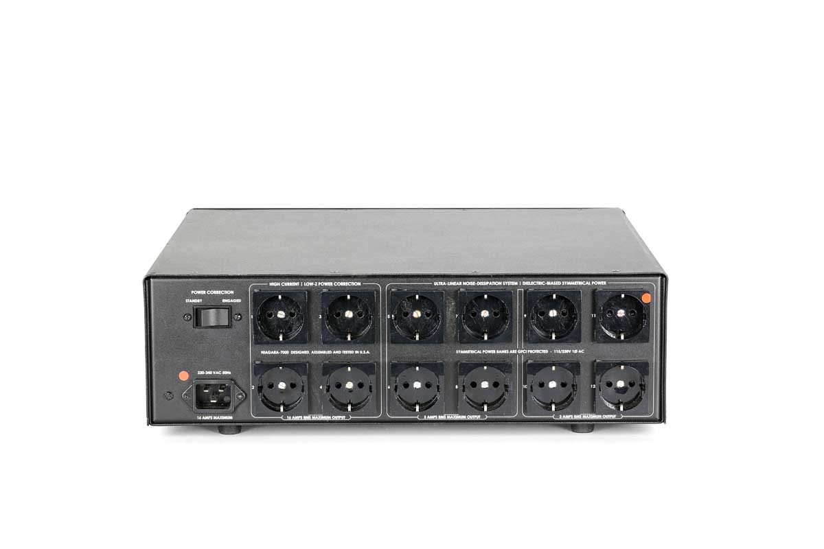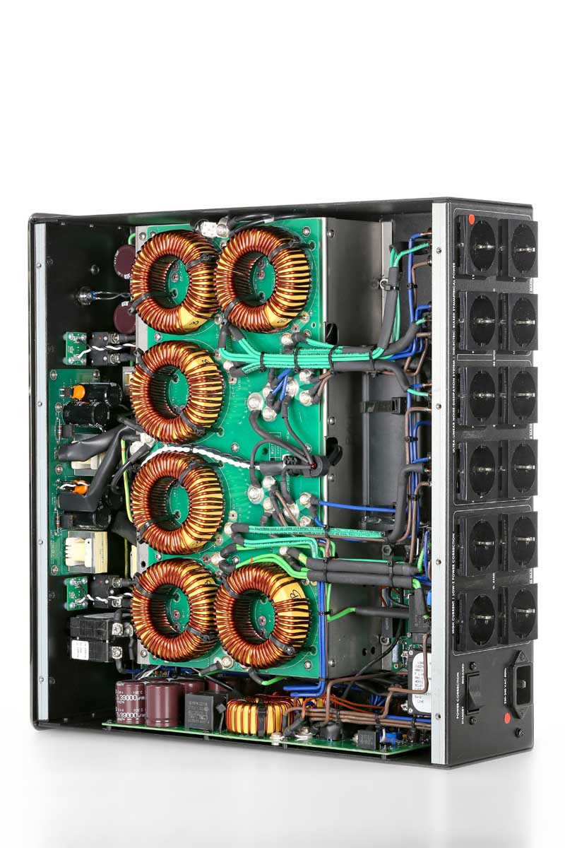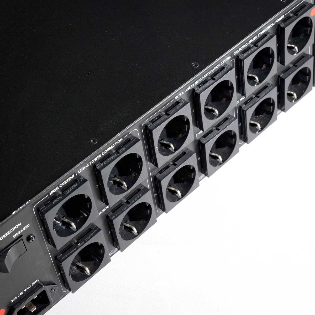 Wechselstromausgänge: 4 x „Hochstrom/TPC“ für Endverstärker, Aktivlautsprecher u.ä., 8 x „ultralinear/dielelektrisch vorgespannt symmetrisch“ für Vorverstärker und Musikquellen (Schuko-Steckdosen)