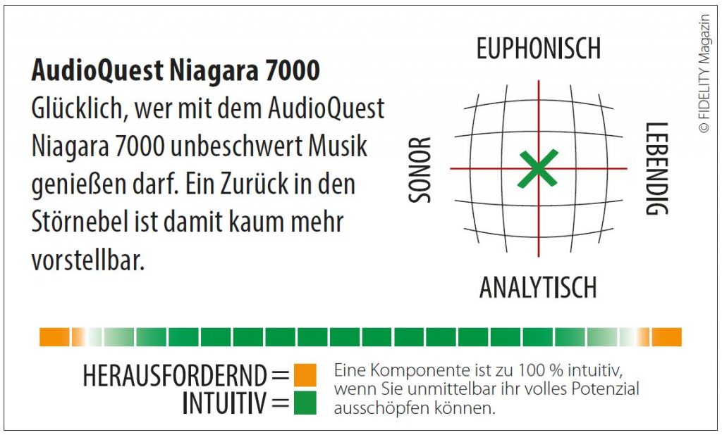 Wem, zweitens, die sportliche (wenngleich absolut faire) Summe für den ganz großen Niagara schlicht zuviel ist, weil zum Beispiel die daran angeschlossene Anlage budgetmäßig nicht recht passen will: Die Niagara-Serie von AudioQuest umfasst auch kleinere, deutlich preisgünstigere Modelle, deren Wirkung vergleichbar effizient und nachhaltig sein soll. Und um die kümmern wir uns in den nächsten Ausgaben der FIDELITY. BIs dahin freuen wir uns heimlich, still und leise, dass wir den 7000er noch ein Weilchen benutzen und tiefer in die Musik eintauchen dürfen. Und gratulieren all jenen, die sich ein solches Meisterwerk leisten können.