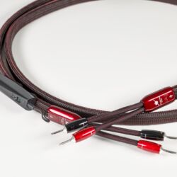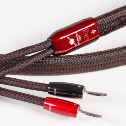 Konzept: AudioQuest „William Tell Zero“ Vollbereichs-Lautsprecherkabel, mit „William Tell Bass“ zum Bi-Wiringkabel erweiterbar. Erhältlich unter anderem in zweimal drei und zweimal fünf Meter, mit Bananensteckern oder Kabelschuhen in Kupfer oder Silber kaltverschweißt konfektioniert. Leitermaterial ist Kupfer von hohem Reinheitsgrad.