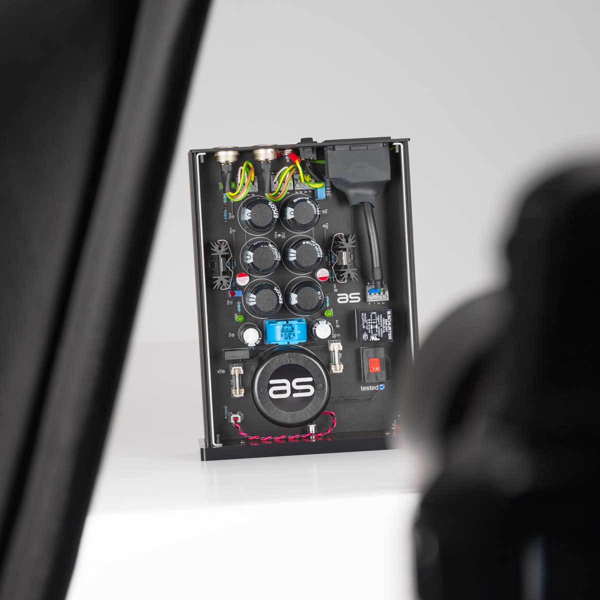 Dazu befreien wir jetzt den Phonolab 1.0 aus seinem B&W-Koffer. Das praktisch unzerstörbare Reiseutensil sorgt übrigens serienmäßig dafür, dass der Inhalt unter allen Umständen unversehrt beim Adressaten eintrifft. Audiospecials verfolgt seinen Manufaktur-Gedanken nämlich so konsequent, dass man auf einen Zwischenhandel verzichtet und Interessenten stattdessen direkt mit einem Demo-Set – bestehend aus dem Netzteil PSU und der Verstärkereinheit Phonolab 1.0 – zum Ausprobieren beglückt.