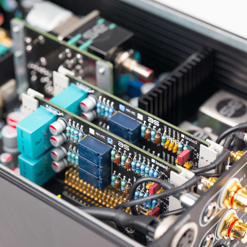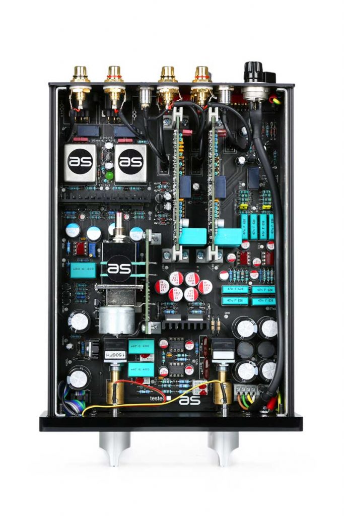Besonderheiten: patentierte Recompizer-Schaltung (stufenlose Korrektur tonaler Schwächen in den Tiefbasslagen), berührungsfreie Eingangswahl, Ground Lift schaltbar, individueller Abgleich per Hand; Netzteil mit 2 Ausgängen, Direktvertrieb mit Probekoffer
