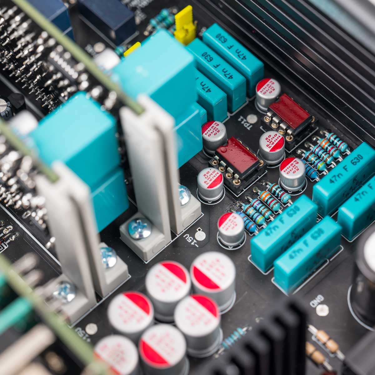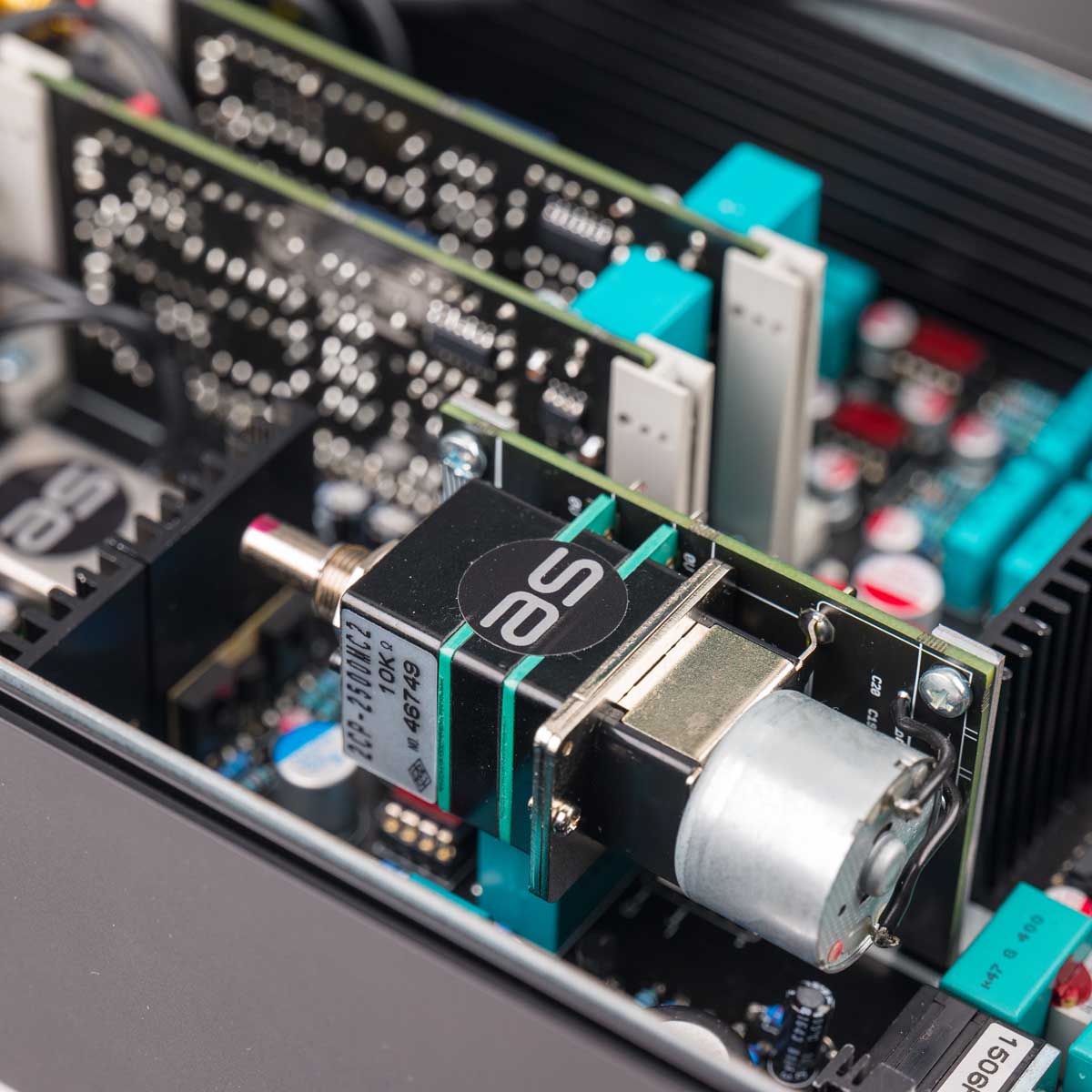 Apropos regeln: Der Recompizer für die dynamische Tiefbassanpassung wird ausschließlich per Hand geregelt. Das dafür zuständige Spezial-Potentiometer, sonst auch gern in der professionellen Studiotechnik und in der Luftfahrtindustrie eingesetzt, wird von Audiospecials per Hand derart präzise abgeglichen, dass man guten Gewissens auf einen Bypass-Schalter verzichten und der mechanischen Nullrastung des Drehknopfs vertrauen darf. Gleiches gilt sinngemäß für den zweiten Drehregler, der die rechte Hälfte der Acryl-Frontplatte verschönert. Er beeinflusst die obersten Höhenlagen bei der Schallplattenwiedergabe und ist – wieder vereinfacht ausgedrückt – für weniger Knackser und Kratzer oder mehr Glanz und Gloria zuständig.
