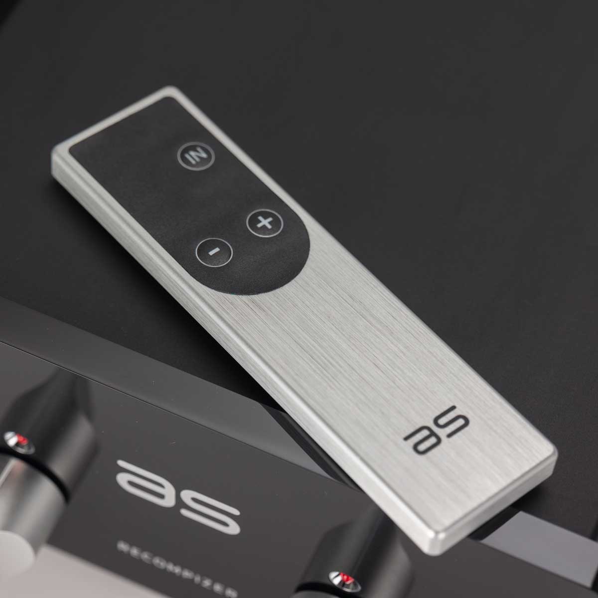 Im konkreten Fall kommt der zweiteilige Audiospecials-Phonoentzerrer in optionaler Vollausstattung zu mir. So ist nicht nur das Anschlussfeld mit symmetrischen (Lemo-)Eingangsbuchsen ausgestattet, sondern auch eine hübsche kleine Metallfernbedienung aus Vollaluminium mit von der Partie. Dieses ebenfalls aufpreispflichtige Extra erlaubt – im Zusammenspiel mit dem dazugehörigen Motorpoti im Inneren – eine direkte Ansteuerung von Endverstärkern oder Aktivlautsprechern, mithin eine klare Empfehlung für Plattenspieler-Puristen. Leider bietet der Phonolab keine optische Rückmeldung für den eingestellten Pegel, und da die Motorpoti-Steuerung gelegentlich auch auf die Laut-leise-Befehle anderer Fernbedienungen reagiert (und vice versa, etwa von Marantz und Hegel), geben wir uns wieder sportlich und hüpfen aus dem Sofa, um den Pegel direkt am jeweiligen Voll- oder Vorverstärker zu regeln.
