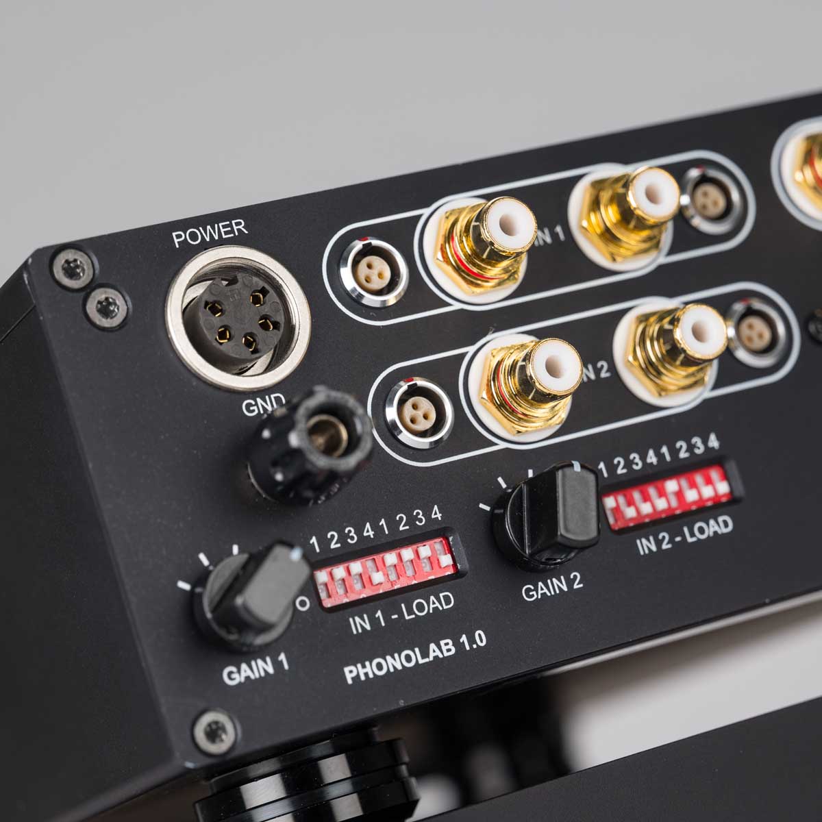 Übrigens kann der optische Auftritt des Phonolab individuell feinabgestimmt werden: Drehknöpfe und LED-Fassungen sind in Silber oder Schwarz, die LEDs in Rot oder Blau lieferbar. Aber auch technisch ist der elegante Zweiteiler ein Maßanzug für Vinylisten. Das fängt mit der grundsätzlich „freien“ Auslegung der beiden elektrisch völlig getrennten Stereo-Verstärkerzüge an: Jede Kombination aus MM- und MC-Zug ist möglich (MC + MC, MM + MM, MC + MM) und bietet pro Eingangspaar vielfältige Anpassungsmöglichkeiten über ein doppeltes Mäuseklavier auf der Rückseite. Zudem lässt sich dort auch der gewünschte Verstärkungsfaktor per Minidrehschalter in vier Stufen wählen. Wem das alles noch nicht exakt (oder extrem) genug ist, der kann für seine liebsten Exoten-Tonabnehmer auch individuelle Anpassungen ordern; die Manufaktur aus Köln macht’s möglich.