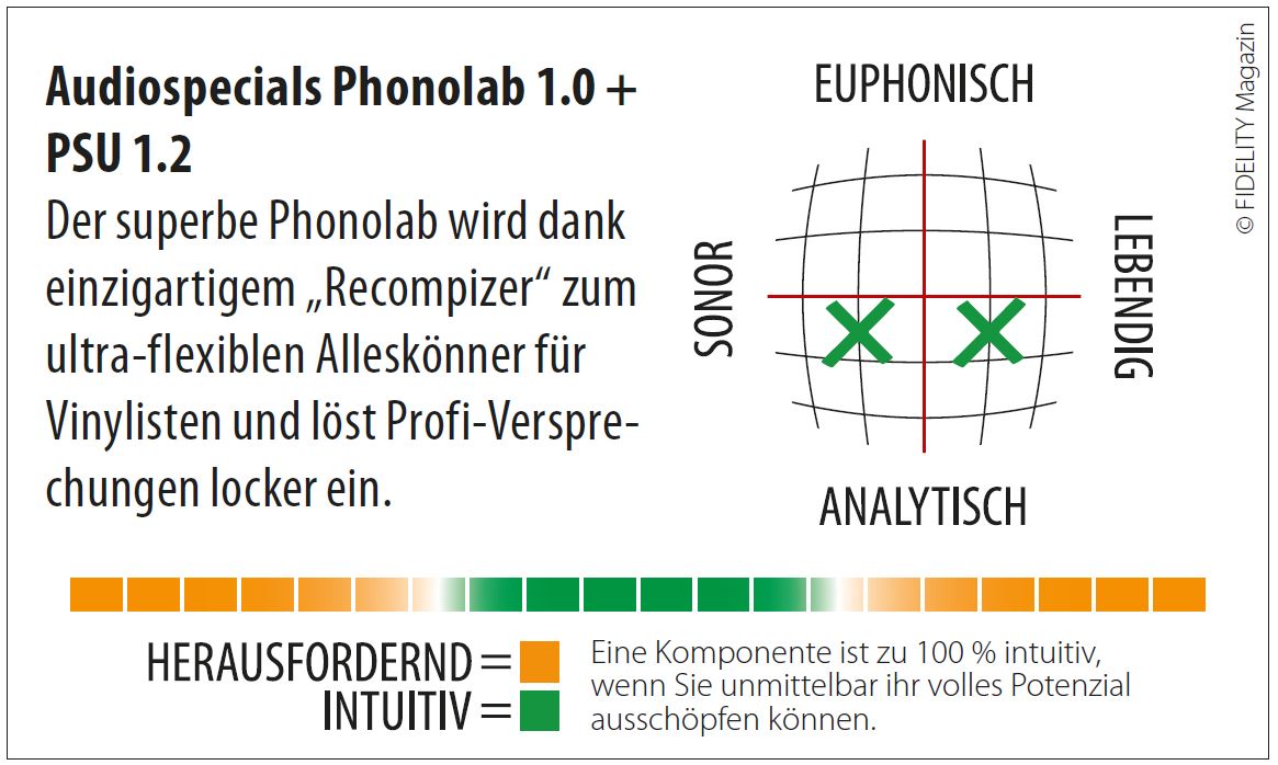 Audiospecials hat mit dem Phonolab 1.0 ein klanglich herrliches, professionell konzipiertes und dank Recompizer zudem einzigartig ausgestattetes High-End-Glanzstück auf die gedrehten Alu-Füße gestellt! Allergrößte Empfehlung für alle Schallplattenfans, deren Lieblingsmusik nicht ausschließlich auf Weltklasse-Vinyl verewigt wurde. Und ebenso dicke Empfehlung für alle, die ganz einfach einen unanfechtbar guten, völlig allürenfreien und zudem sehr schicken Phonoentzerrer wollen. Sie werden den genialen, allerfeinst dosierbaren Geschmacksverstärker wohl nur ausprobieren, wenn keiner guckt. Übrigens: Der superstabile Koffer ist im mehr als fairen Preis inbegriffen.