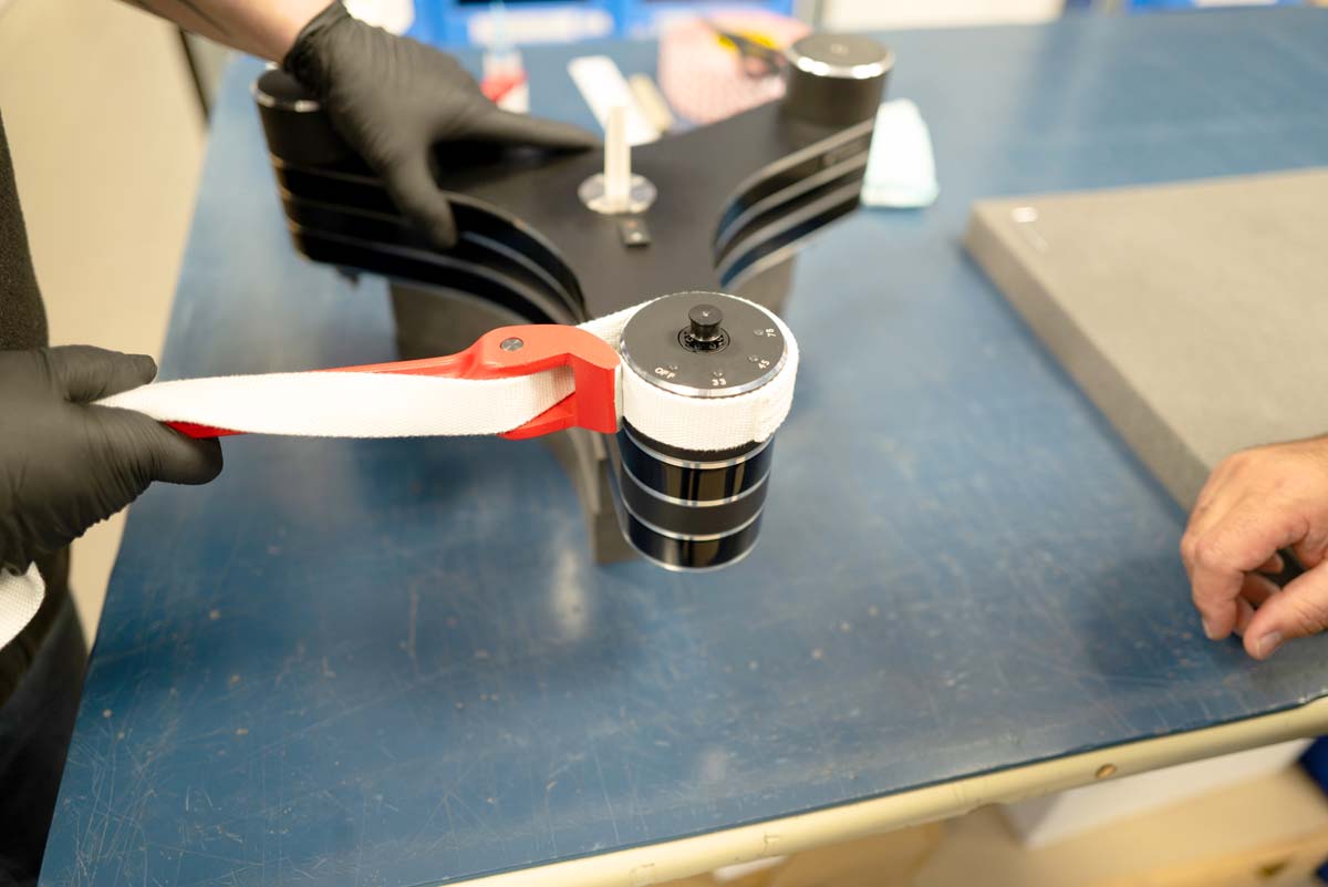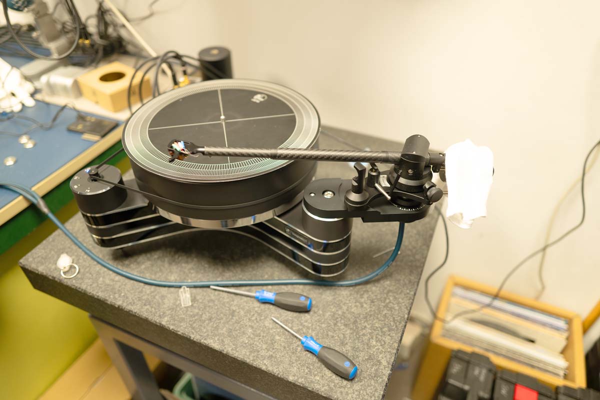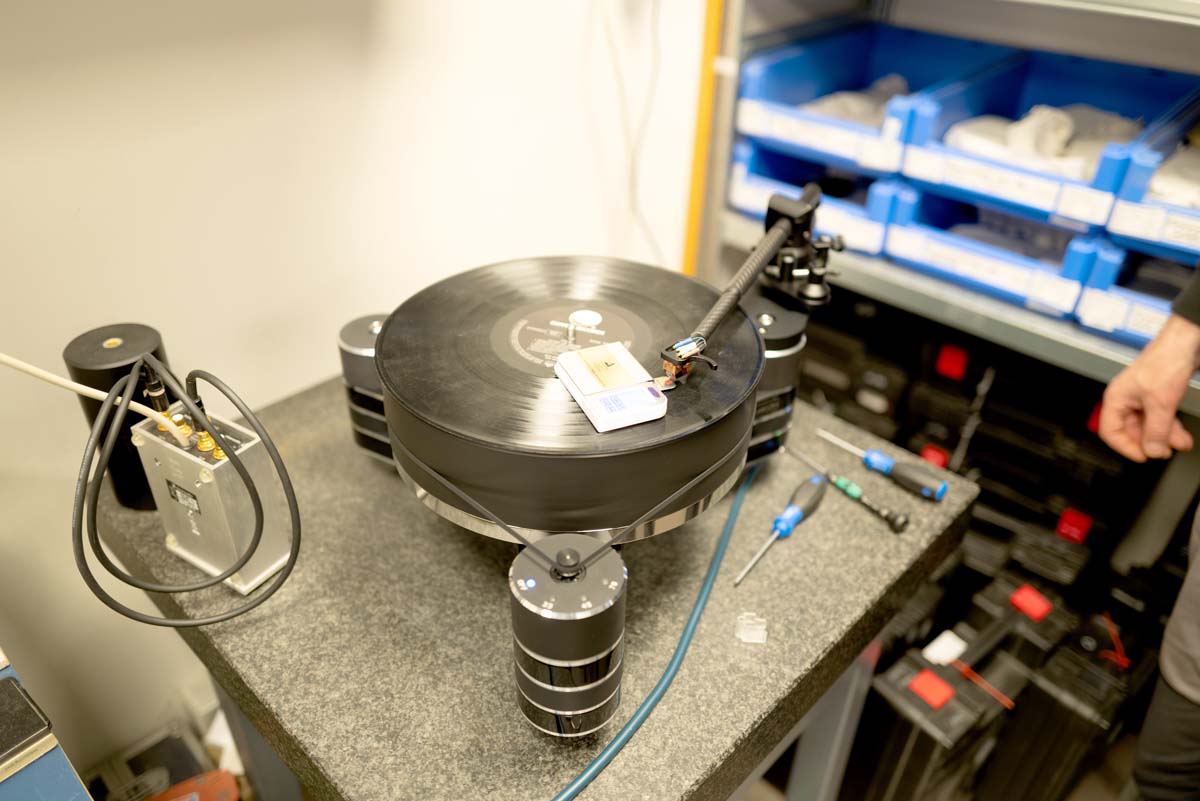 Der Tonarm ist inzwischen mit seinem neuen Kabel zurück aus der Elektrofertigung und wird sogleich passend montiert. Ist alles exakt ausgemessen, darf sich der Teller des Plattenspielers gute zwanzig Minuten auf dem eigens dafür vorhandenen Laufwerkstisch drehen (man beachte die massive Granitplatte), erst dann wird die Geschwindigkeit des Laufwerks überprüft. Der Grund hierfür ist einleuchtend: Zuerst soll sich das neue Öl im Lager einmal überall verteilen und auf gleichmäßige Temperatur kommen. Erst dann werden mittels eines kleinen Schraubendrehers und unter Zuhilfenahme einer Stroboskopscheibe die vorgegebenen Geschwindigkeiten (mit 300 Hz, weil man es da viel genauer sieht) eingestellt. Zur Überprüfung daheim reichen aber die bekannten 50 Hertz, ergänzt der Techniker. Er verrät mir noch einen kleinen Trick, wie man testen kann, ob die Lager des Tonarmes noch tadellos sind: Einfach den Tonarm frei am Laufwerk schweben lassen und ihm einen kleinen (!) Schubs geben. Dann sieht man ihm zu, wie er sich langsam auspendelt – und wenn hierbei keine Auffälligkeiten zu erkennen sind, ist „alles schick“.