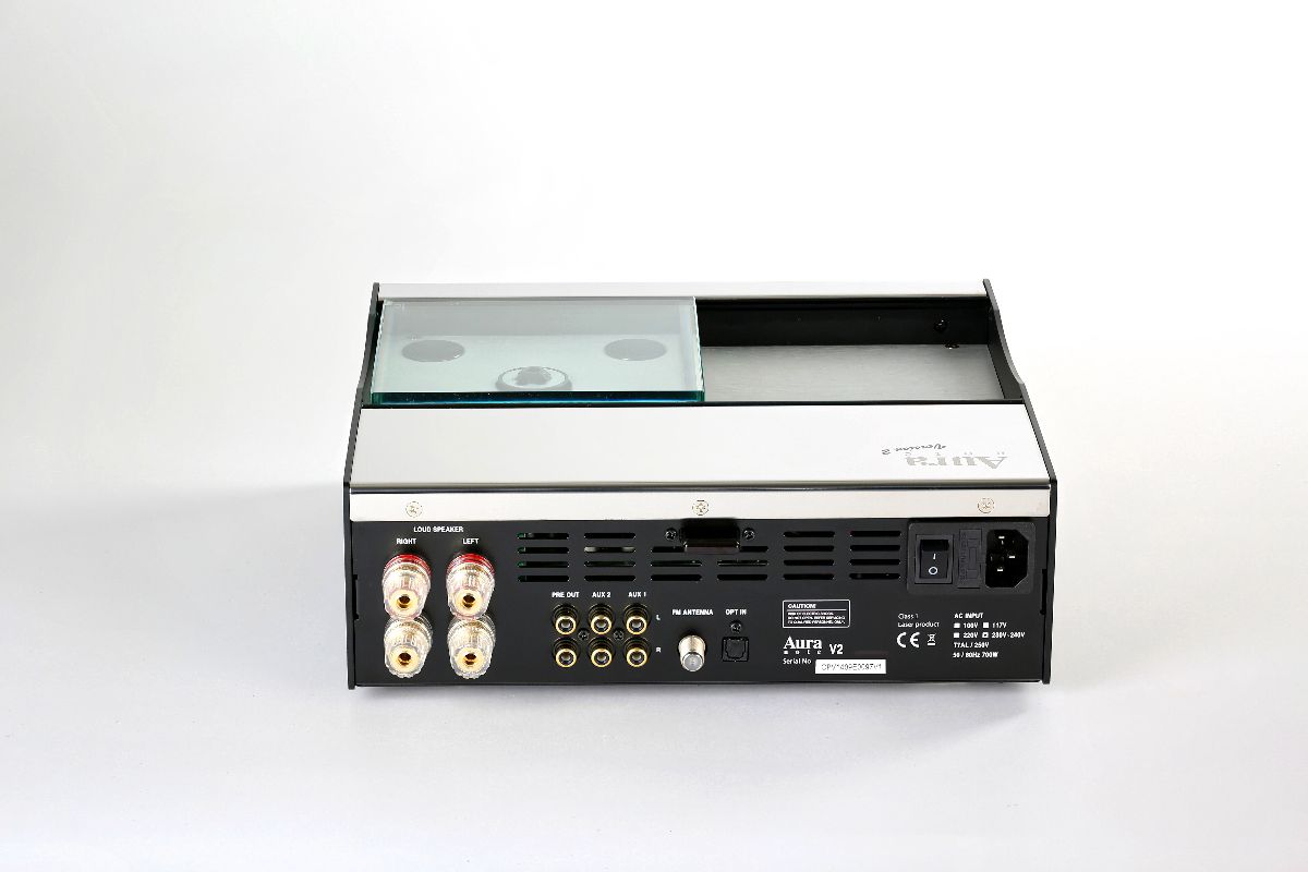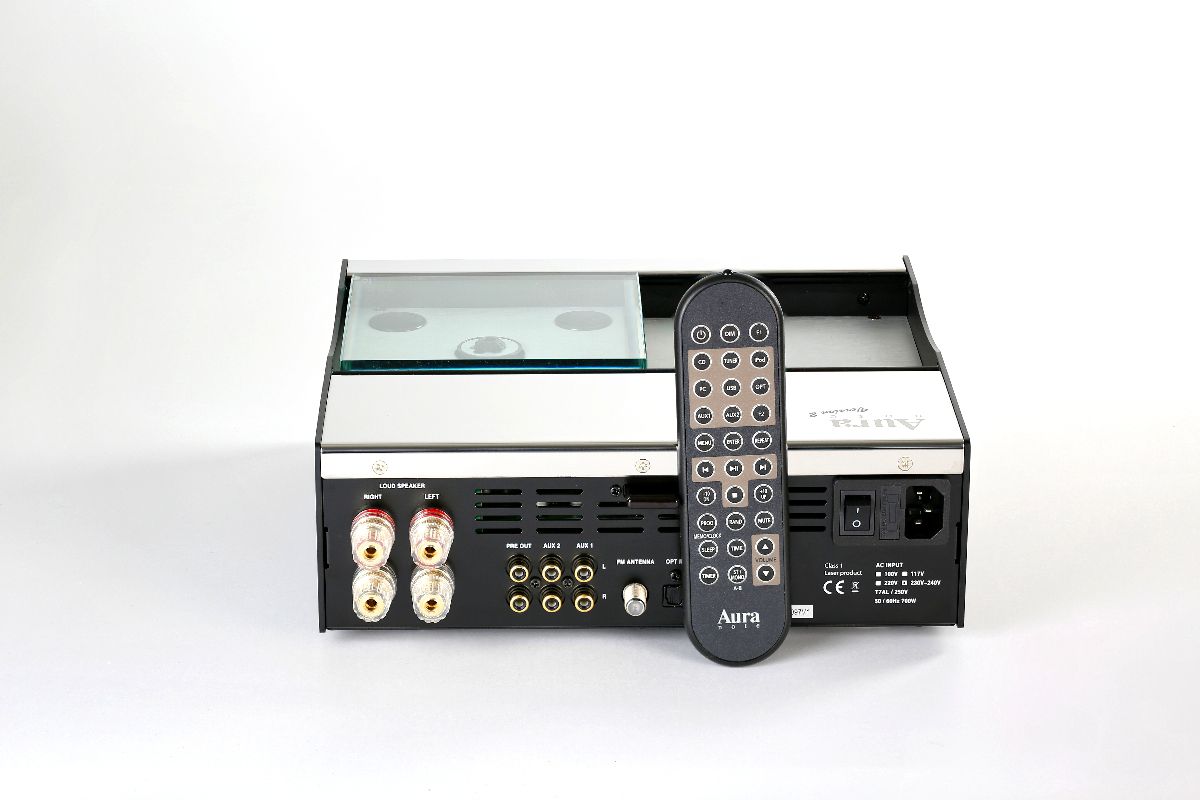Streng genommen ist der Aura Note eine Kompaktanlage. In einer Kiste, deren Stellfläche kleiner als eine Langspielplattenhülle ist, finden sich CD-Spieler, DAC, Verstärker, Radioempfänger und Wecker. Klingt nett, muss aber dringend präzisiert werden: Aura hat dem Note in der Inkarnation „Version 2“ doch tatsächlich die guten ICEpower-Endstufen aus dem Hause Bang & Olufsen spendiert. Diese Class-D-Briketts leisten flotte 2 x 125 Watt an 8 Ohm und klingen … ach – das verrate ich später. Der CD-Spieler wiederum kommt in Form eines Topladers. Zum Einlegen der CD schiebt man eine butterweich gelagerte Glasscheibe zur Seite. CD auflegen, mit Puck fixieren und die Glasabdeckung wieder zur anderen Seite schieben – fertig. Das ist zwar etwas mehr „Arbeit“ als das Füttern per Slot-in oder Lade, dafür sieht es sehr, sehr geil aus. Die USB-Anschlüsse gestatten wahlweise die Verbindung mit einem iPod (der digital ausgelesen wird), einem Computer oder mit externen Sticks bzw. Festplatten. Ein S/PDIF-TosLink-Eingang wird ebenfalls geboten. Bei einer PC-Verbindung kann der interne DAC Material bis 24 bit/192 kHz verarbeiten. Weiterhin bietet der Aura Note Version 2 noch einen Kopfhörerausgang, einen Pre Out und einen Bluetooth-Empfänger.