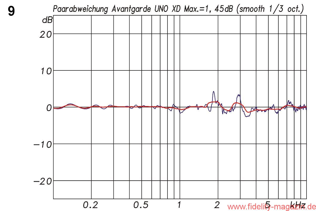 Abb. 9 zeigt dazu die Differenzfunktion der beiden Uno XD. Bedingt durch die Größe der Lautsprecher und einiger Interferenzeffekte in den Übergangsbereichen ist die Messung nicht ganz unproblematisch. Geglättet mit ⅓ Oktave liegt der Wert bei akzeptablen maximal 1,45 dB.