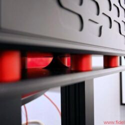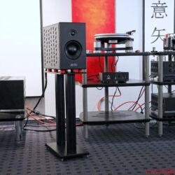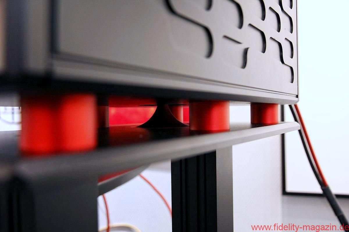 Die AVID Reference Four ist nominell das kleinste Modell im Portfolio der Engländer. Sie könnte offiziell wohl gerade noch als Kompaktlautsprecher durchgehen. Doch was „klein“ und „kompakt“ bei AVID bedeutet, macht die Reference Four schon beim ersten Seitenanblick deutlich. Sie ist mit rund 45 Zentimetern tiefer als hoch, bringt solo stolze 26 Kilogramm auf die Waage und wird idealerweise mit einem fast ebenso schweren Spezialständer zu einer massiven Einheit verschraubt. Sechs farblich variable Verbindungselemente aus Aluminium sorgen auf Wunsch für einen gewissen Hinguckeffekt – im HiFi-Studio Bramfeld war das ein wunderschönes Tiefrot. Wer ganz genau hinschaute, konnte auf der oberen Platte des Stativs eine elegant eingearbeitete Schallführung entdecken, welche die Bassreflexöffnung in der Lautsprecherunterseite unterstützt – für eine perfekte Teamarbeit von Box und Stativ. Und nur eine von zahlreichen Besonderheiten der Reference Four.