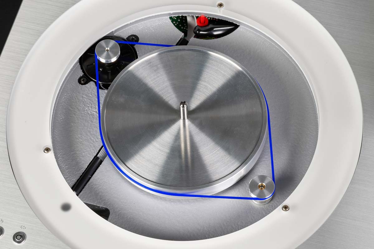 Ein Blick in das Innenleben: Das Antriebskonzept, bei dem der Riemen zwei diametral gegenüberliegende Kontaktflächen zum Subteller hat, sorgt für symmetrische Krafteinwirkung ohne Kippmoment. Um eine Konstruktion mit mehreren Motoren zu vermeiden (Stichwort: elektromagnetische Interferenzen), nutzt der R 5.3 MK2 einen passiven Umlenkpulley.