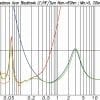 Die Ayon Black Hawk ist als klassisches 3-Wege- System mit passiver Weiche aufgebaut. Wer ein mögliches Übersprechen zwischen den Filterzweigen der Weiche verhindern möchte, kann auf Bi-Wiring- Betrieb umstellen und so den Tieftonzweig und den Mittelhochtonzweig mit getrennten Kabeln zur Endstufe führen, die dann, einen hinreichenden Dämpfungsfaktor einmal vorausgesetzt, vagabundierenden Strömen zwischen den Filterzweigen den Garaus macht. Für das Messlabor bietet das Bi-Wiring-Terminal zudem noch den Vorteil, dass die Wege einzeln vermessen werden können, was einen besseren messtechnischen Einblick in die Box bedeutet. Abbildung 1 und 2 zeigen dazu zunächst die Verläufe der elektrischen Impedanz in Betrag und Phase. Sehr gut ist hier zu erkennen, wie für den Tieftonweg (rot) mit Tiefpassfilter im Signalweg der Betrag der Impedanz zu den hohen Frequenzen hin ansteigt und sich die Phase schnell dem Wert von + 90° nähert. Letzteres bedeutet eine rein induktive Last, die durch die Serienspule im Tiefpassfilter bei hohen Frequenzen entsteht. Komplementär dazu verhält sich der Mittelhochtonzweig (blau) mit einem Hochpassfilter, wo eine Serienkapazität die Impedanz zu den tiefen Frequenzen hin ansteigen lässt, um dann auf einen Phasenwinkel von – 90° hinauszulaufen. Beides zusammen ergibt den Verlauf der Box als Ganzes (grüne Kurven), wo sich ein Impedanzminimum von 5,3 ? bei 93 Hz erkennen lässt sowie eine Abstimmung des Bassreflexgehäuses auf 35 Hz.