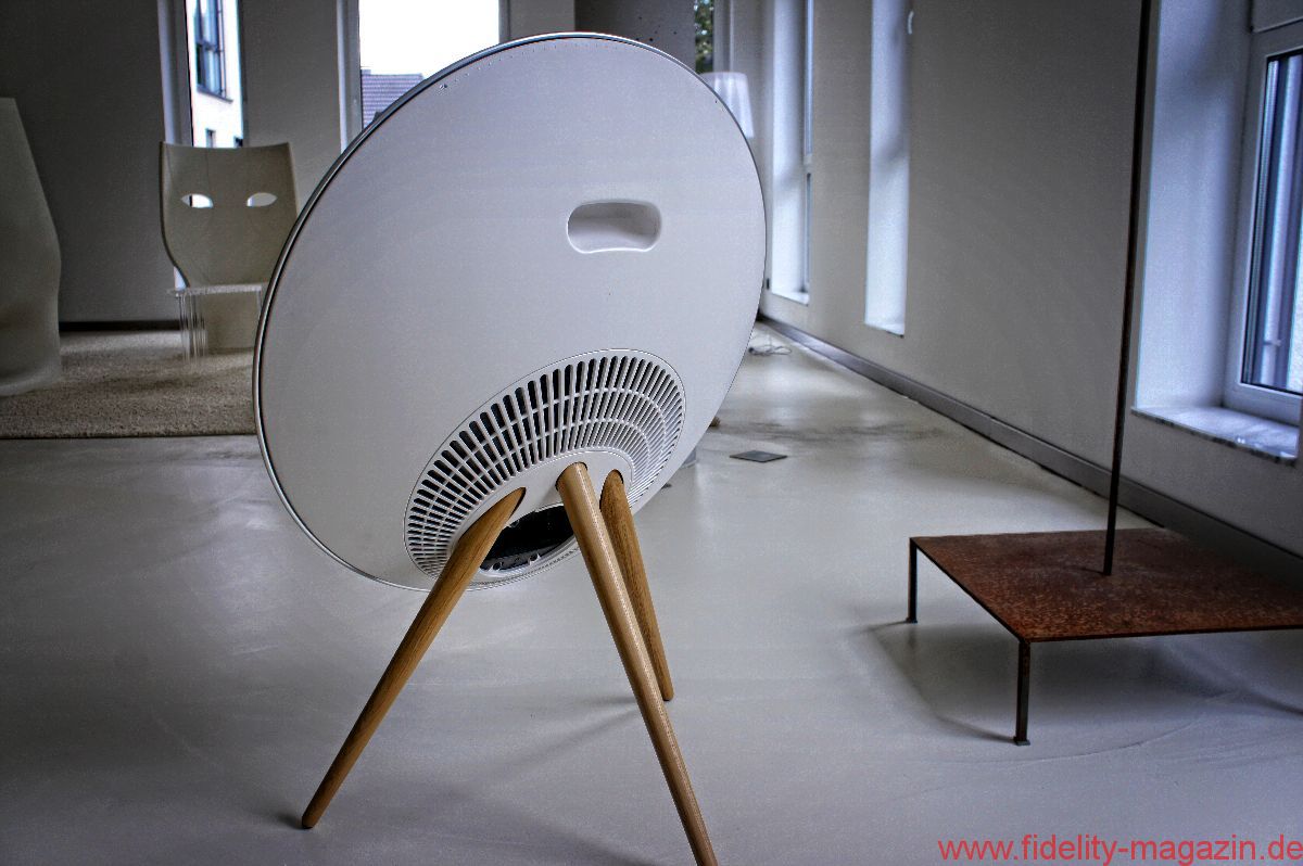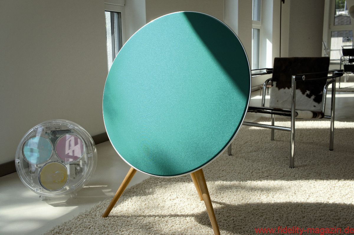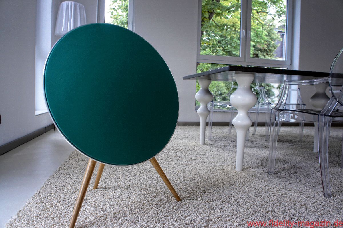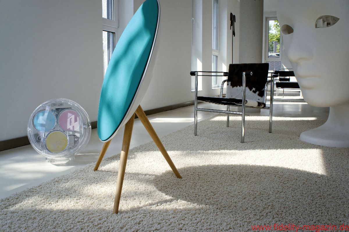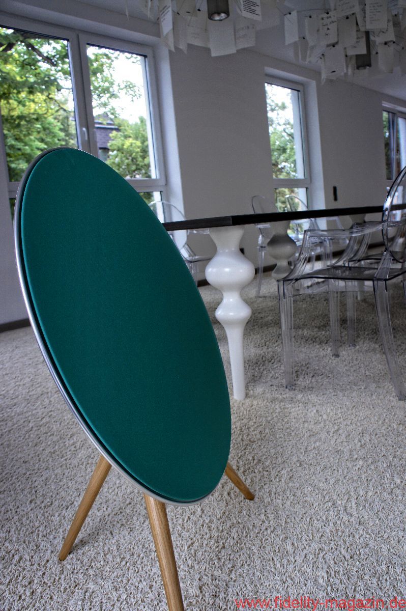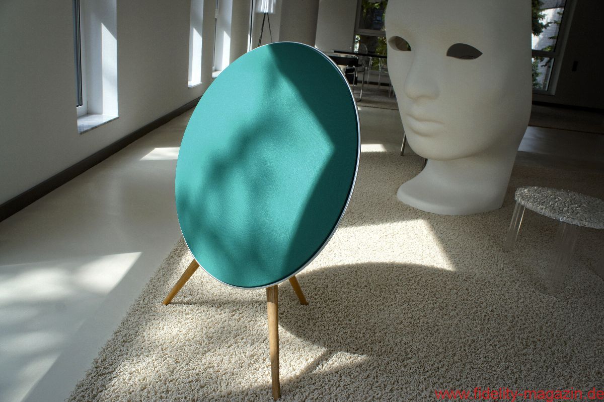 Die auf den ersten Blick sehr dezent wirkende Scheibe hat einen Durchmesser von 70 Zentimeter und hört auf den Namen BeoPlay A9. Die Skulptur steht wahlweise auf drei Holzbeinen oder hängt in einer eigens für sie designten Wandhalterung. Ihre Stoffbespannung kann man, wie auch die Holzart der Beine, in verschiedenen Ausführungen ordern.