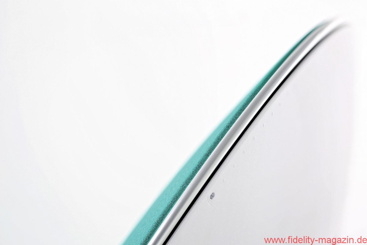 Neben USB- und Ethernet-Anschluss kann man auch einen analogen Line-Eingang nutzen, alle befinden sich auf der Rückseite des Diskus’ etwas unterhalb der Kreismitte. Bedienelemente sucht man zunächst vergebens, dennoch ist das wichtigste – die Lautstärkeregelung – im oberen Rand der Scheibe integriert. Streicht man zwischen den gedachten Zeigerstellungen von ca. „10 bis 2 Uhr“ über den Rand der Scheibe, kann man damit die Lautstärke des Systems erhöhen, verringern oder auch stumm schalten. Unkompliziert ist auch die Nutzung des A9 als AirPlay-System. Nicht nur iPhone oder iPad können kabellos als Musikdatenbank genutzt werden, sondern auch Tablets oder Smartphones mit Android-Betriebssystem …