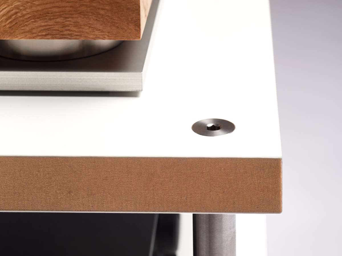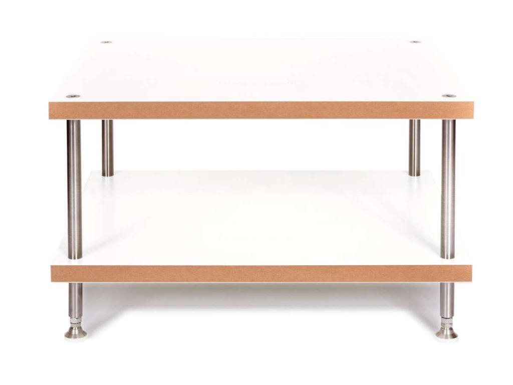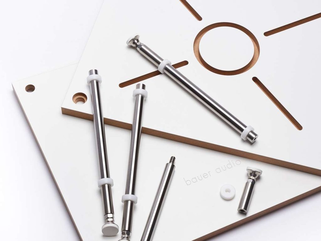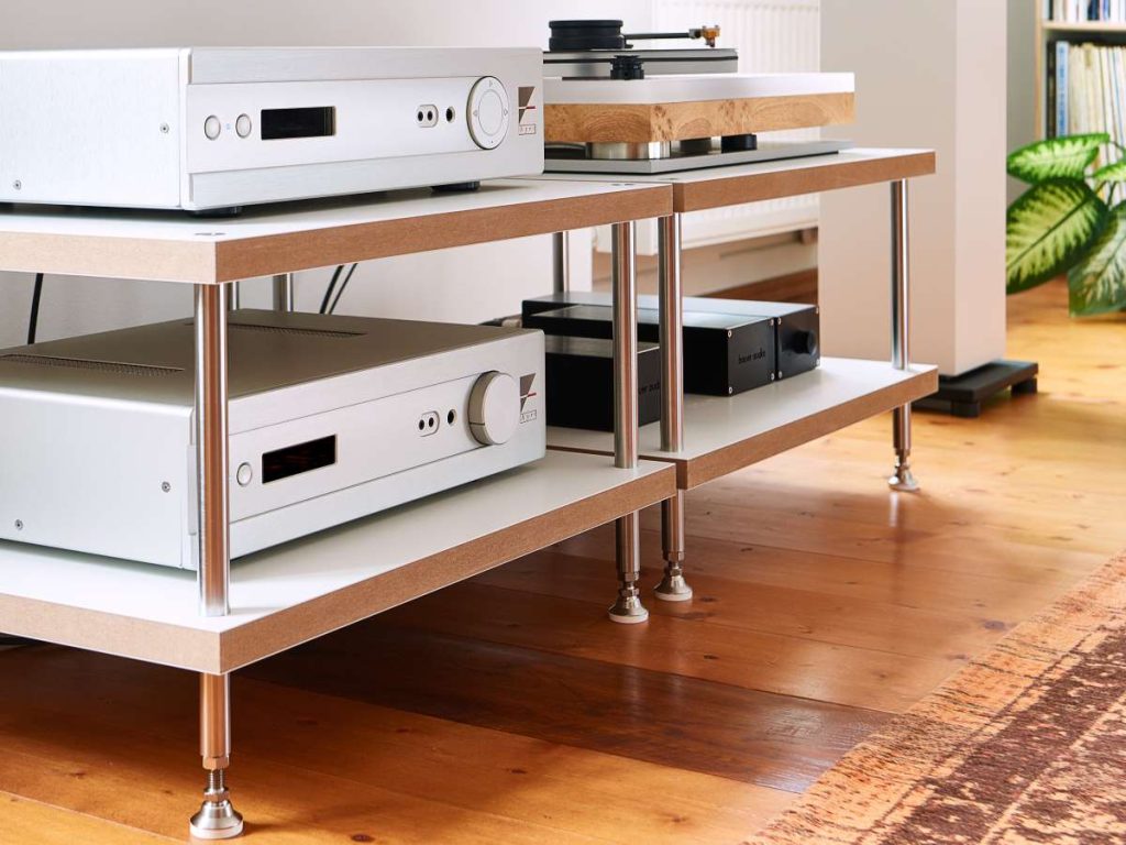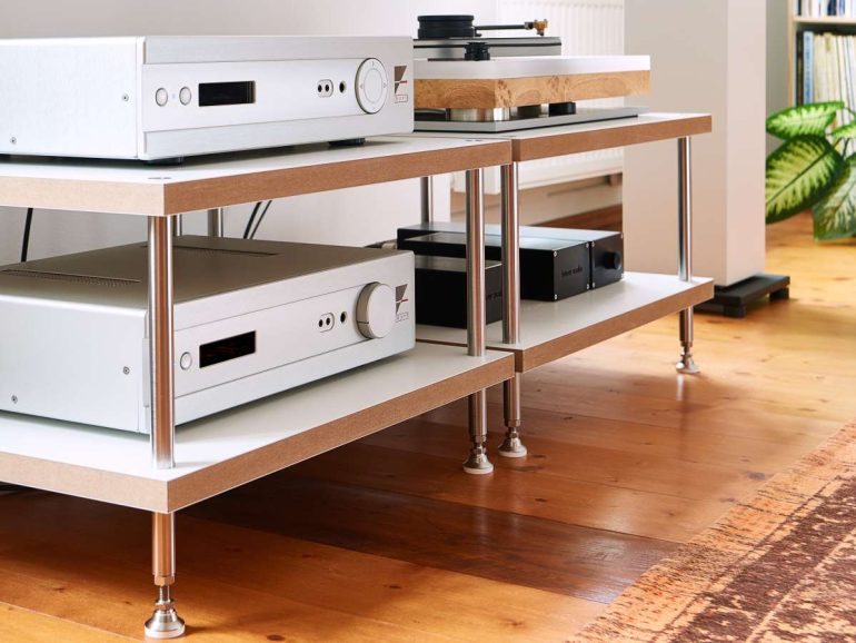 Willi Bauer, der seit über zwei Jahrzehnten den Plattenspieler dps produziert und dabei das eine oder andere über Resonanzkontrolle gelernt hat, hatte schon vor Jahren ein schlichtes Regal zum Gebrauch in seinem Vorführraum konstruiert. Tests mit unterschiedlichen Materialien führten ihn später zu laminiertem MDF und einer losen Lagerung der Böden auf Kunststoffringen. Letzteres minimiert die Übertragung von Bodenvibrationen und beugt torsionalen Verspannungen vor. Darüber hinaus sorgt sie für ein wenig Spiel – und damit Entkopplung – in der horizontalen Ebene. Weil die Frequenz, mit der das Regal sanft schwankt, unterhalb des hörbaren Spektrums liegt, kommt es nicht zu störenden Interferenzen.