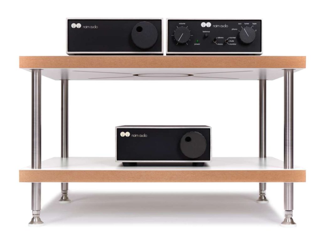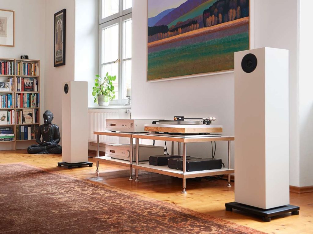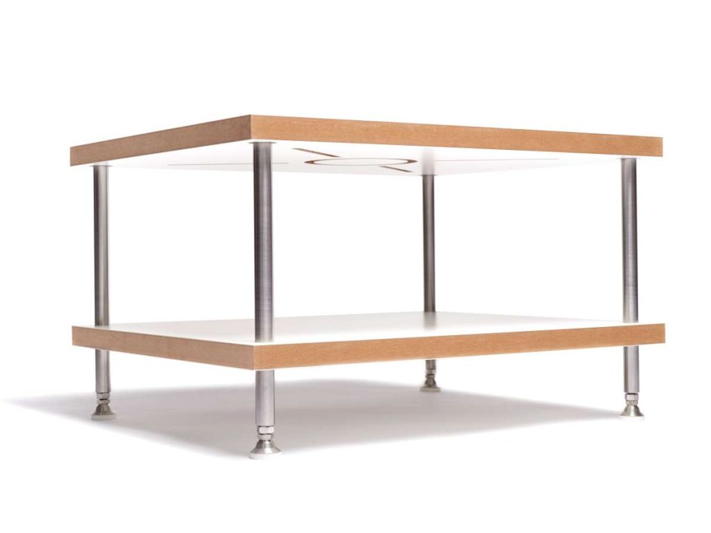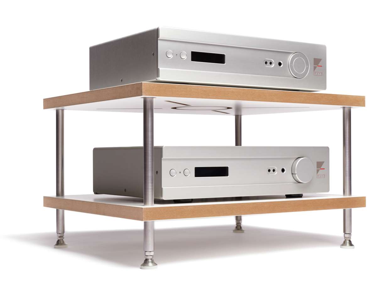 Willi Bauer, der seit über zwei Jahrzehnten den Plattenspieler dps produziert und dabei das eine oder andere über Resonanzkontrolle gelernt hat, hatte schon vor Jahren ein schlichtes Regal zum Gebrauch in seinem Vorführraum konstruiert. Tests mit unterschiedlichen Materialien führten ihn später zu laminiertem MDF und einer losen Lagerung der Böden auf Kunststoffringen. Letzteres minimiert die Übertragung von Bodenvibrationen und beugt torsionalen Verspannungen vor. Darüber hinaus sorgt sie für ein wenig Spiel – und damit Entkopplung – in der horizontalen Ebene. Weil die Frequenz, mit der das Regal sanft schwankt, unterhalb des hörbaren Spektrums liegt, kommt es nicht zu störenden Interferenzen.