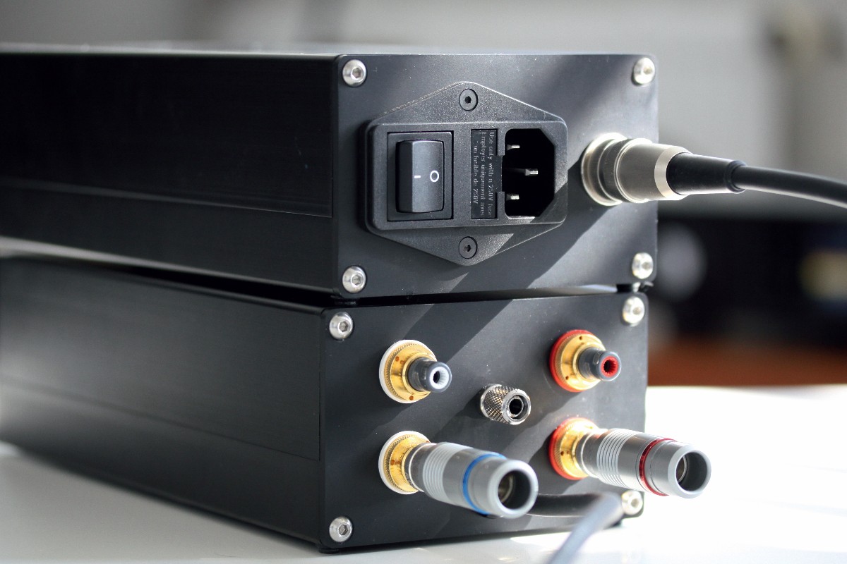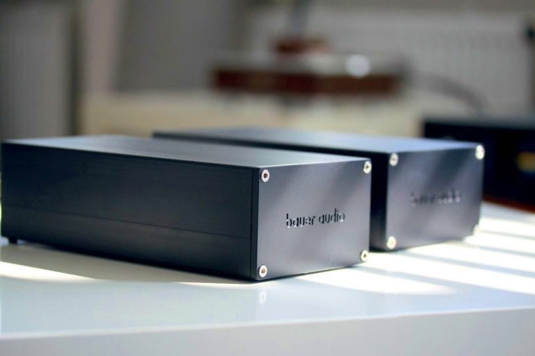 Nun also die erste Elektronikkomponente. Der Bauer Phono ist ein Gemeinschaftswerk von Bauer und dem Elektronik-Spezialisten Dan Nistor und gibt optisch die materialisierte Schlichtheit: zwei schwarz eloxierte Gehäuse, eins für das Schaltnetzteil, eins für die Audio-Schaltung, ein Pärchen Eingangsbuchsen, ein Pärchen Ausgangsbuchsen, eine Erdungsklemme. Keine Knöpfe, keine Schalter.