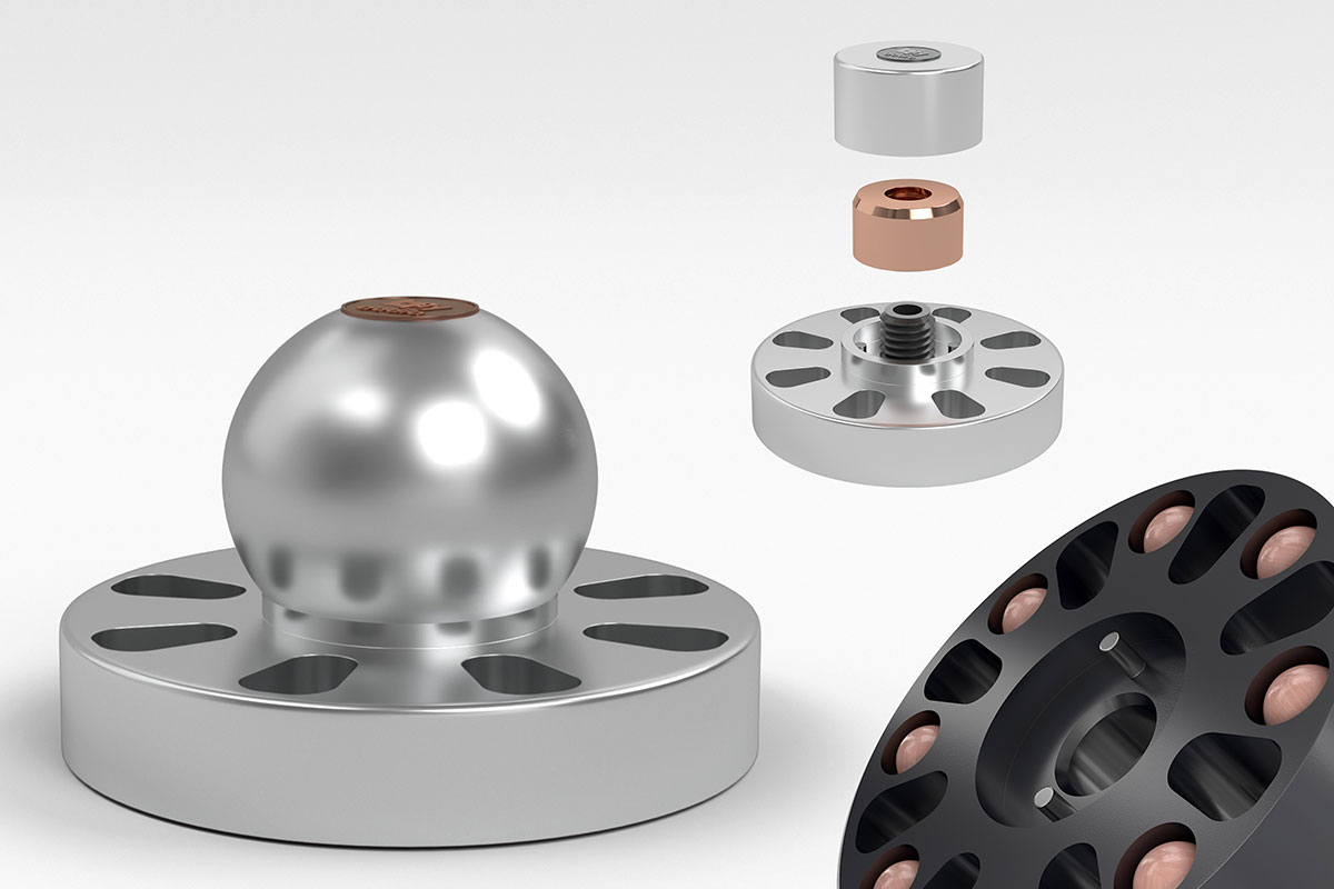Auf der Unterseite des Octopus sorgen 8 zweilagige Absorber für eine Ruhigstellung der LP. Halbkugeln aus Buchenholz nehmen hier die Schwingungen der Schallplatte auf und leiten sie weiter an Gel-Pads, welche die Schwingungen letztendlich eliminieren. Die Schwingungen, ausgehend vom Dorn des Plattenspielers, absorbiert die Dornaufnahme aus resonanzarmen Spezialkunststoff, sowie ein Zylinder aus Kupfer, der in den Knauf des Octopus Light eingesetzt ist.