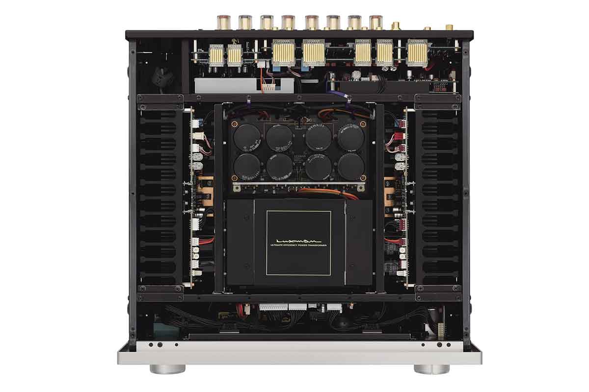 Luxman L-590AXII – Im Gehäuse des bulligen Vollverstärkers (28 Kg) stecken zwei getrennte Mono-Integrierte. Das bewirkt eine traumhafte Kanaltrennung und einen Signal-Rauchabstand von 105 dB.