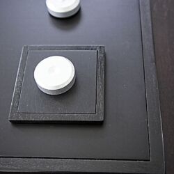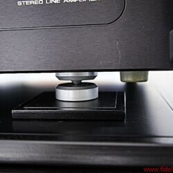 • Sound Spacers: schwarze MiniBoards ca. 70 mal 70 mm, Sandwich aus Magnesium/Birke/Magnesium unter Gerätefüße und Spikes, auch unter Lausprechern mit Bodenschutzfunktion