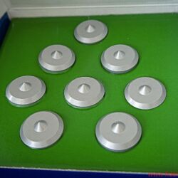 • Sound Spikes: runde silberne Magnesium Pucks mit angegossenem Spike von 5mm, Gesamthöhe 17 mm, unter Plattformen Spitze oben, unter Geräten, Spitze unten oder als Systemfuß in Kombi mit den Sound Pucks