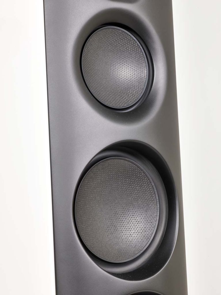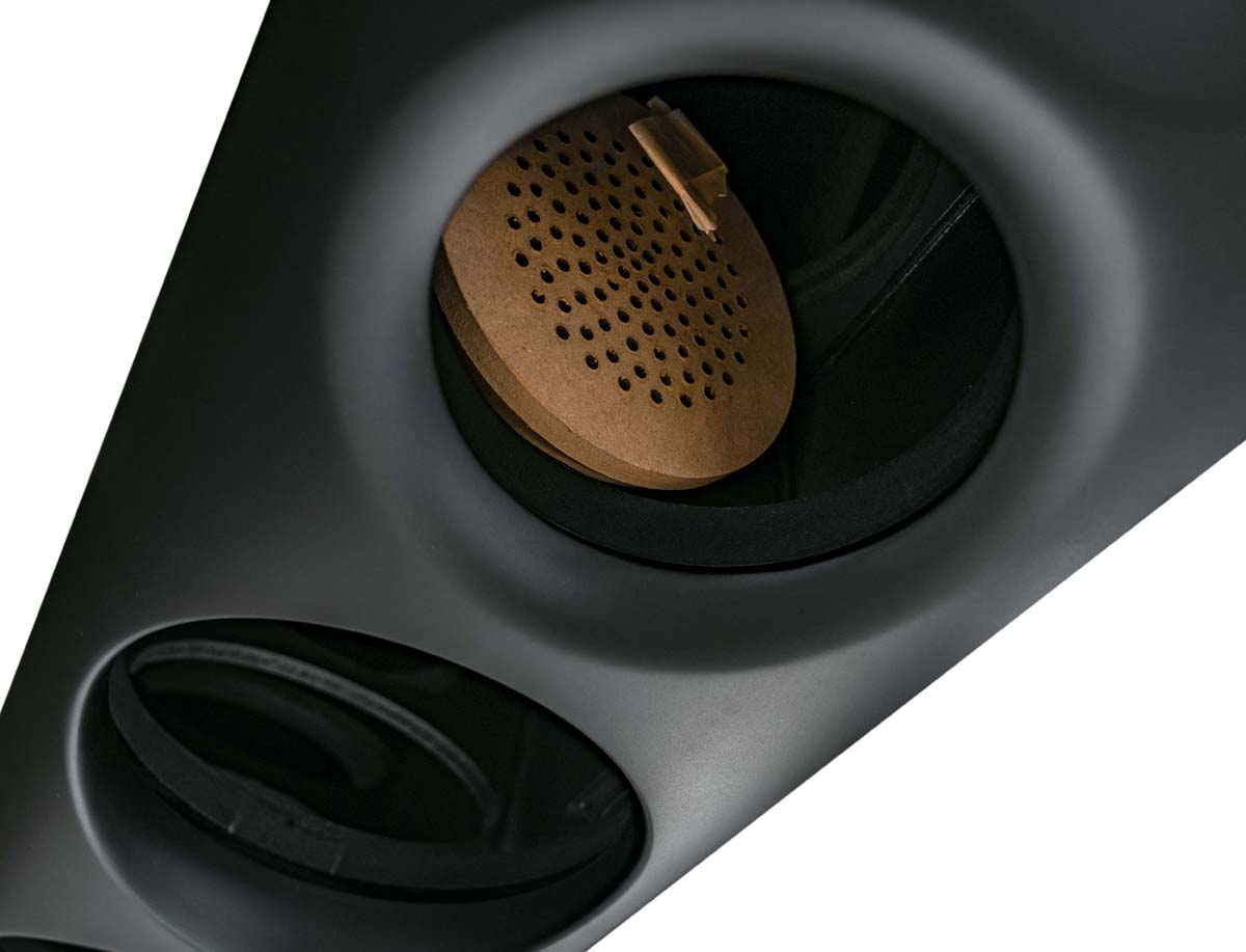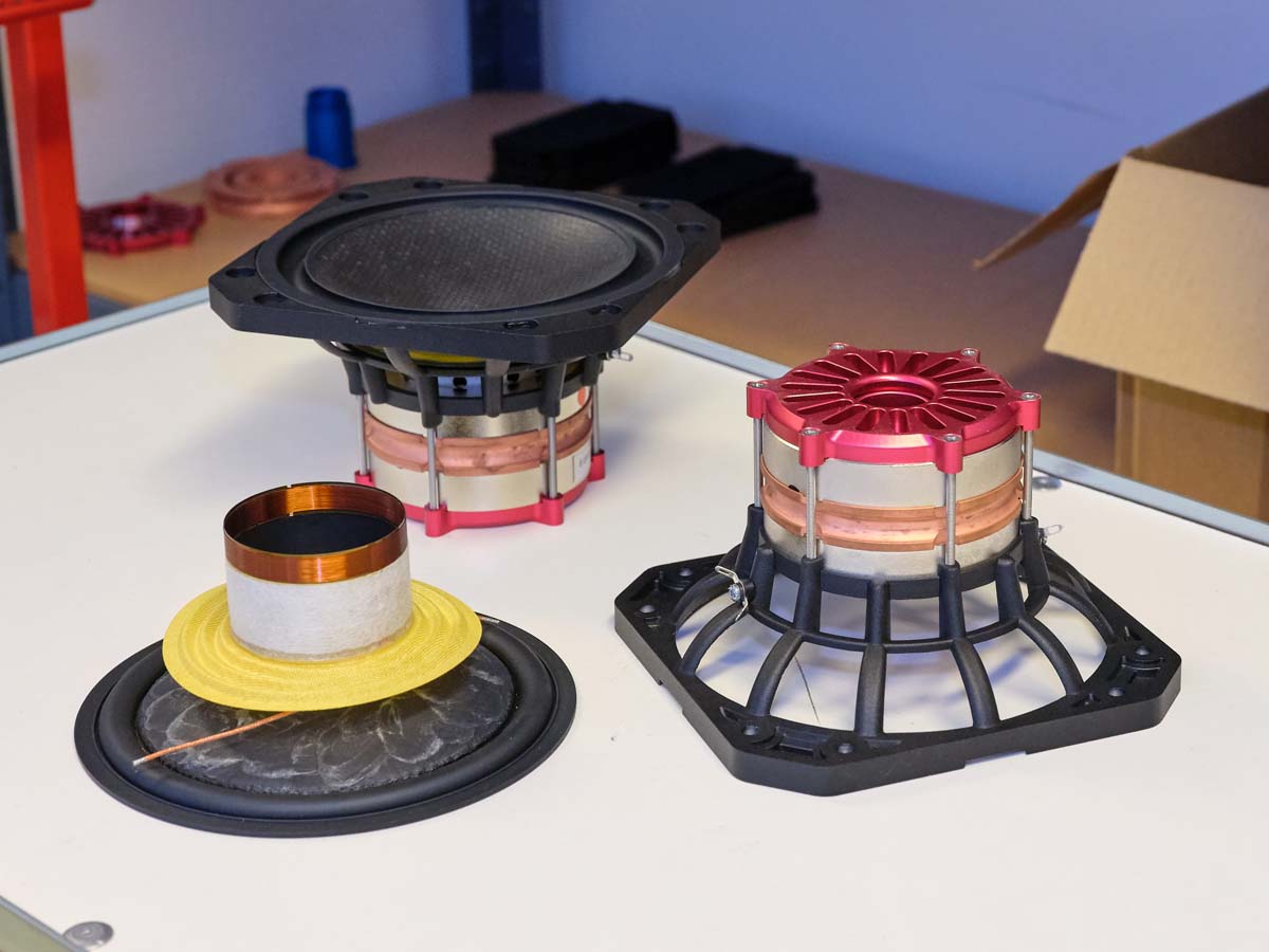 Die Membran selbst besteht aus einem Hightech-Sandwich: Zwei hauchdünne Lagen Carbon umschließen einen dünnen Kern aus Nomex-Waben. Herausragende Stabilität, gerade bei vertikalen Schwingungen, bei gleichzeitig minimalem Gewicht – das ist die Kombination, von der Lautsprecherhersteller immer träumen. Dass die Spulen aus verkupfertem Aluminium bestehen, um wiederum Leitfähigkeit und Masseeinsparung zu verbinden, darf man als nette Dreingabe sehen.