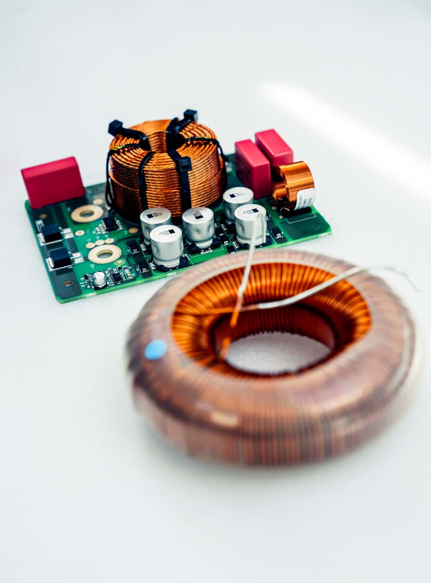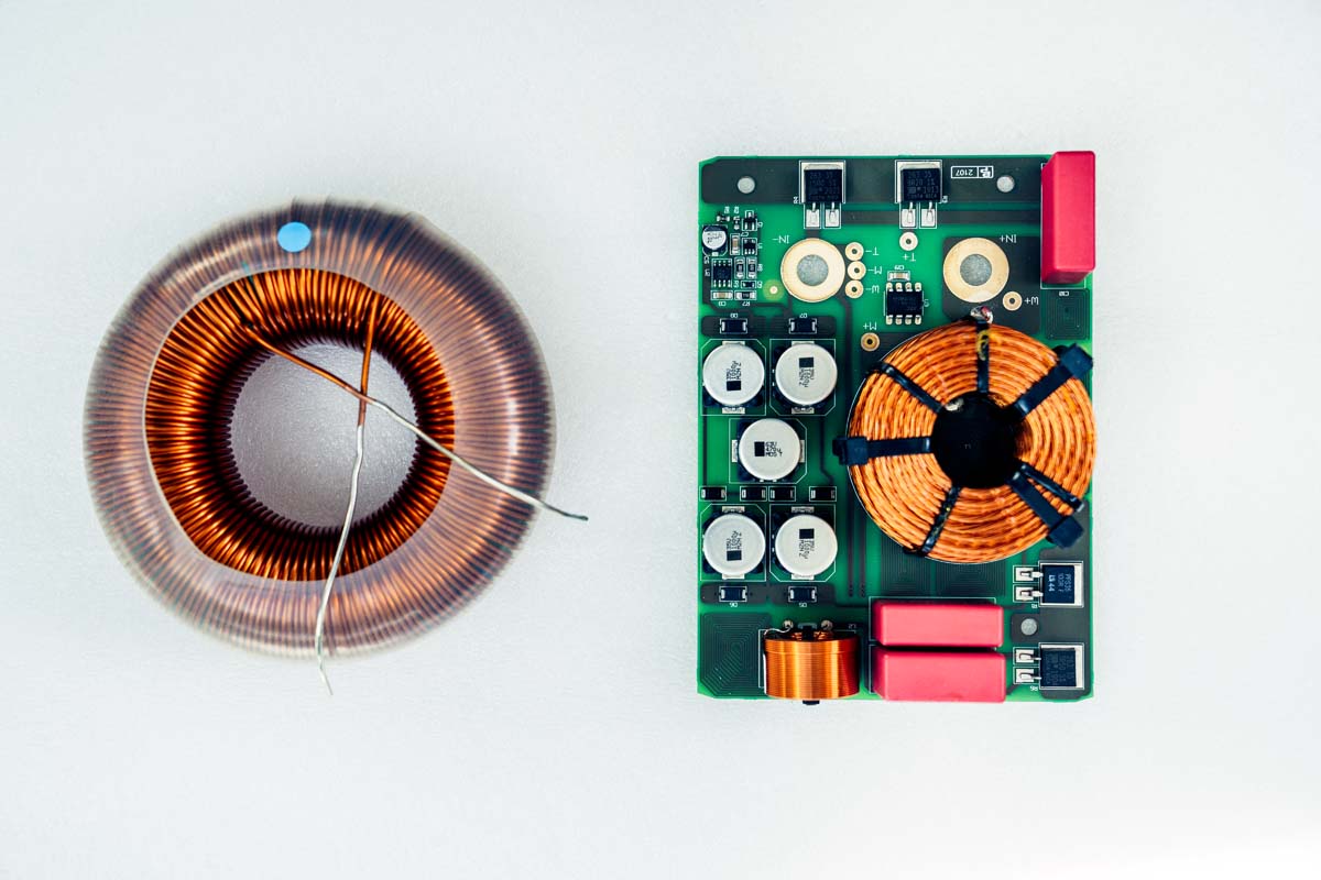 Auch die Frequenzweiche unterscheidet sich gründlich von den üblichen Konstruktionen: Wir finden auf ihr ein paar Halbleiter, was eine rein passive Weise doch irgendwie ausschließt. Tatsächlich – es geht wieder einmal um die Reduzierung von Verzerrungen – soll eine von einem Mikrocontroller erzeugte Rechteckfrequenz wiederum elektromagnetisch auf die Bauteile der Weiche wirken und Arbeitspunkte stabilisieren, Übernahmeverzerrungen herabsetzen. Was genau dort passiert, bleibt im Dunkeln. Ob es wirkt, können wir mangels Vergleich zu einer Box ohne diese Zutat nicht sagen. Spannend ist es allemal.