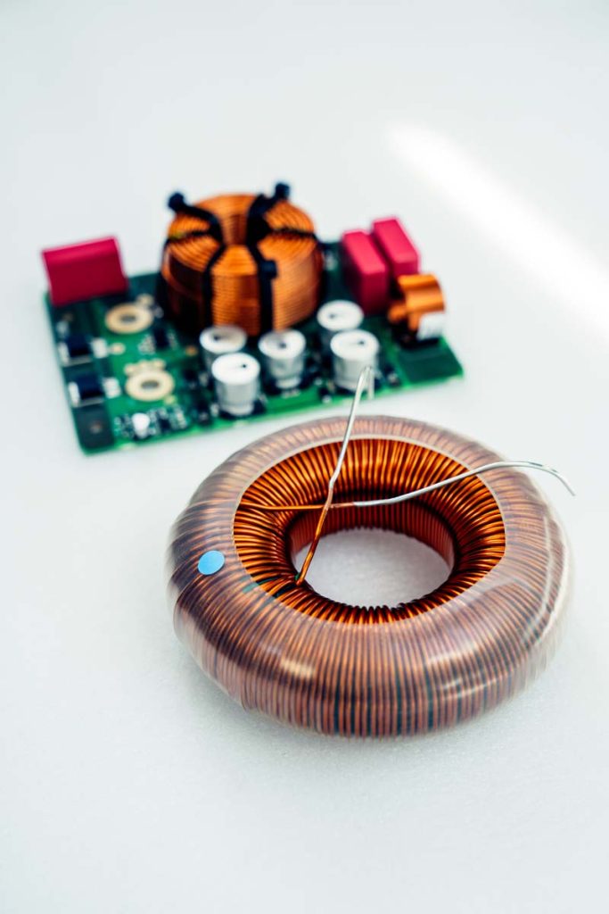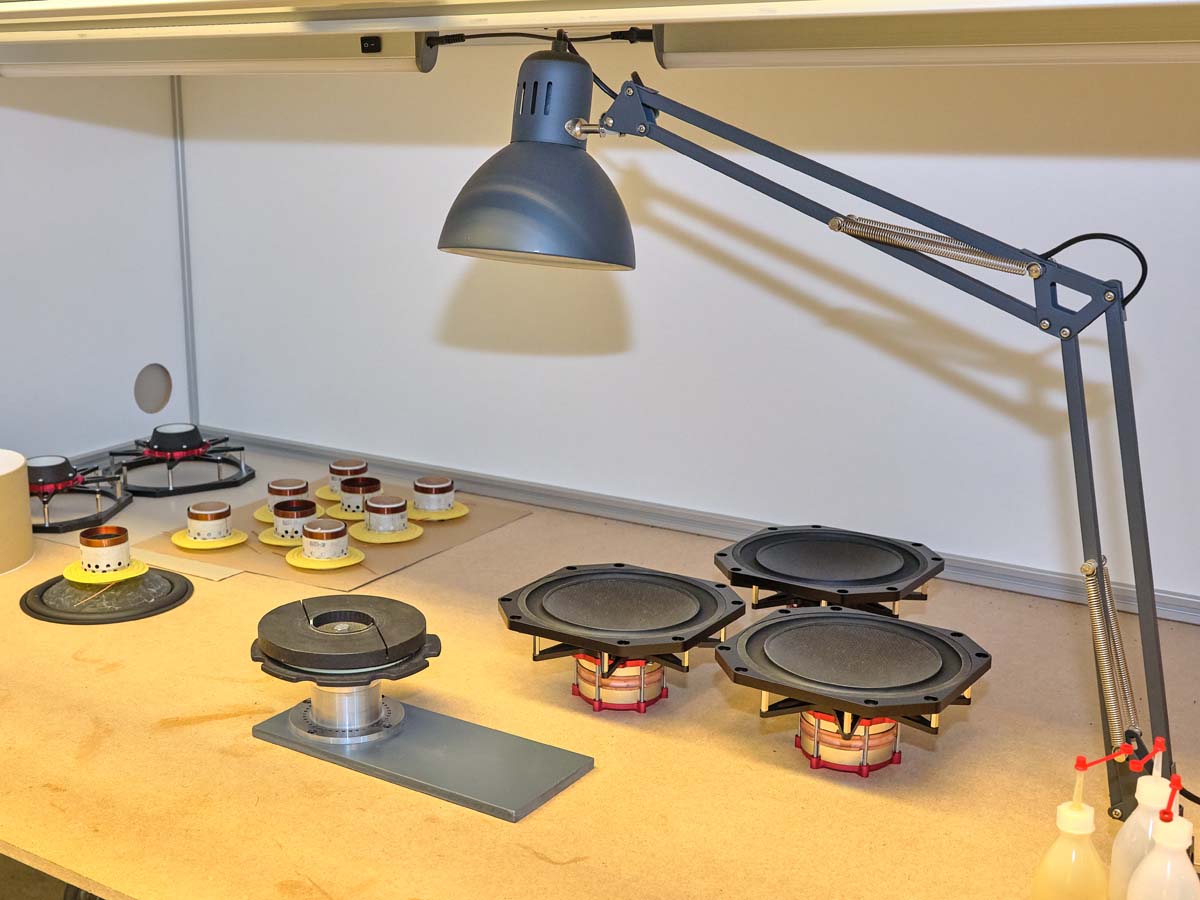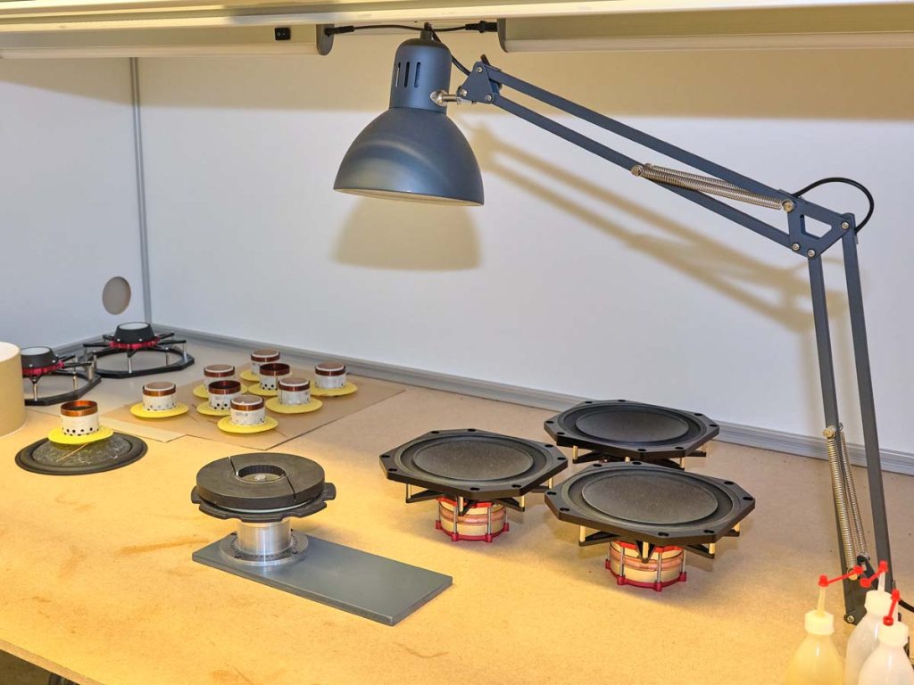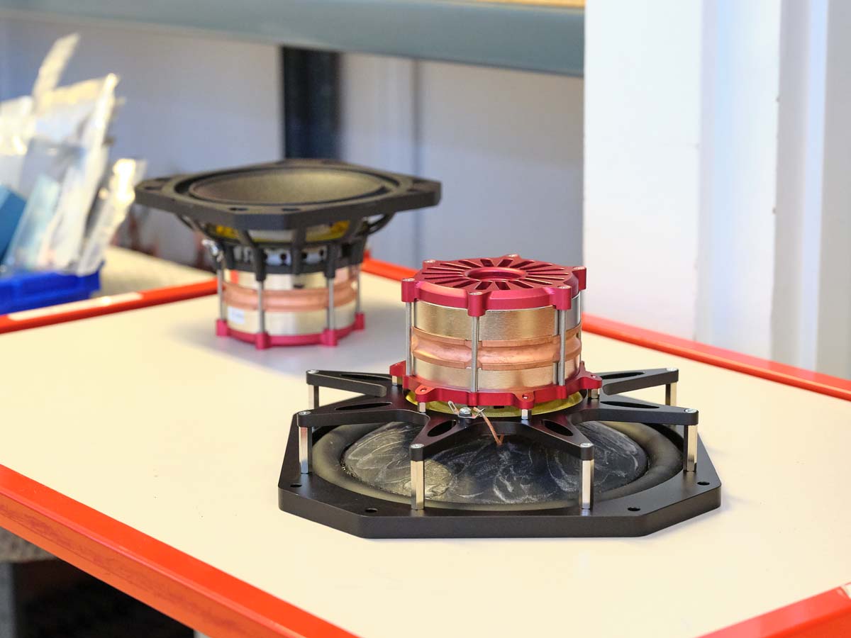 Als Beispiel sehen wir uns die Konuschassis an, die natürlich, wie alle anderen Bauteile auch, im eigenen Hause gefertigt werden. Der Antrieb dieser Lautsprecher geriet in Borresens Blick – dem Eisen, das zwecks Zentrierung des Magnetfelds in den Polplatten steckte, wurde attestiert, Verzerrungen zu verursachen. Also simulierte und experimentierte man so lange mit unterschiedlichen Materialien und Geometrien, bis ein komplett eisenfreier und magnetisch wunderbar zentrierter Antrieb herauskam. Gerade einmal lächerliche 0,6 Millihenry Induktion können sich sehen lassen und werden meines Wissens von keinem Wettbewerber getoppt.