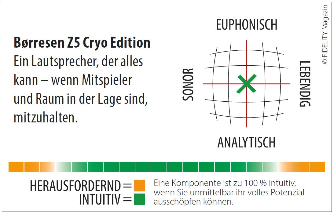 Oft sind es kleine Kompressionseffekte, minimale Verzerrungen, die einem Ton ein kleines Krönchen aufsetzen, um zu mehr Durchsetzungskraft verhelfen. So meint man, auch bei nicht vollständiger Aufmerksamkeit, „mehr“ zu hören. Das fällt hier völlig weg, und dem unaufmerksamen Hörer mag die Z5 Cryo daher im ersten Moment langweilig vorkommen. Spitzt man aber seine Ohren, merkt man von Minute zu Minute mehr, wie viel weniger Schlechtes und wie viel mehr Gutes einem die Borresen gönnt. Und dabei ist es völlig gleich, um welche Musikrichtung es geht. Wir hörten uns quer durch unsere Tidal-Playlists und konnten von Adams bis Zappa faszinierende Entdeckungen erleben.