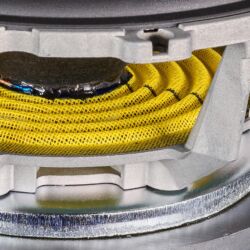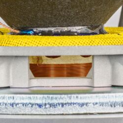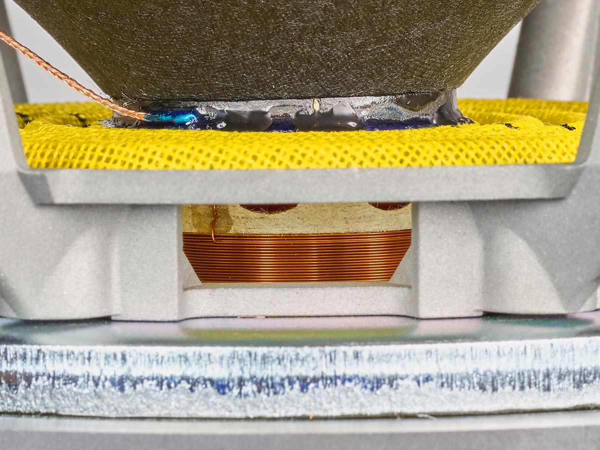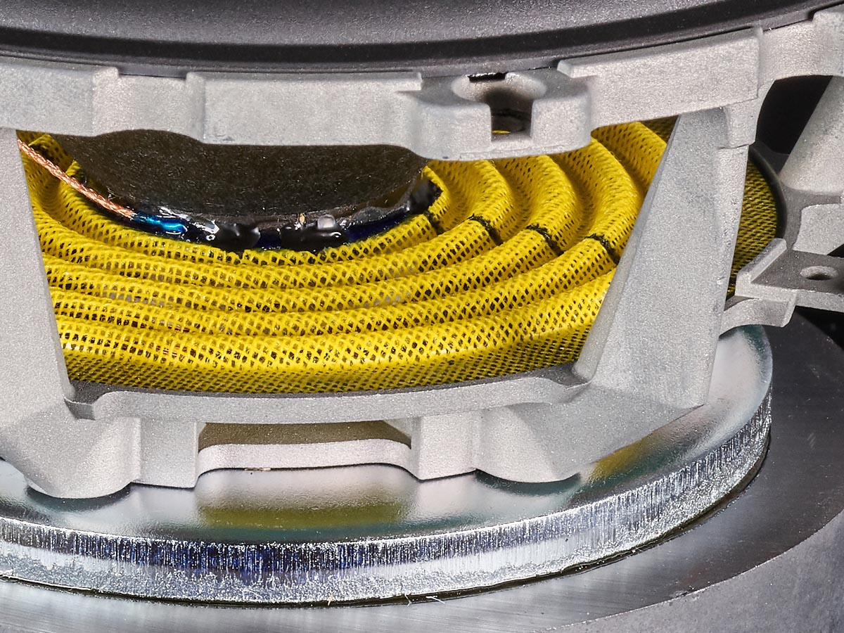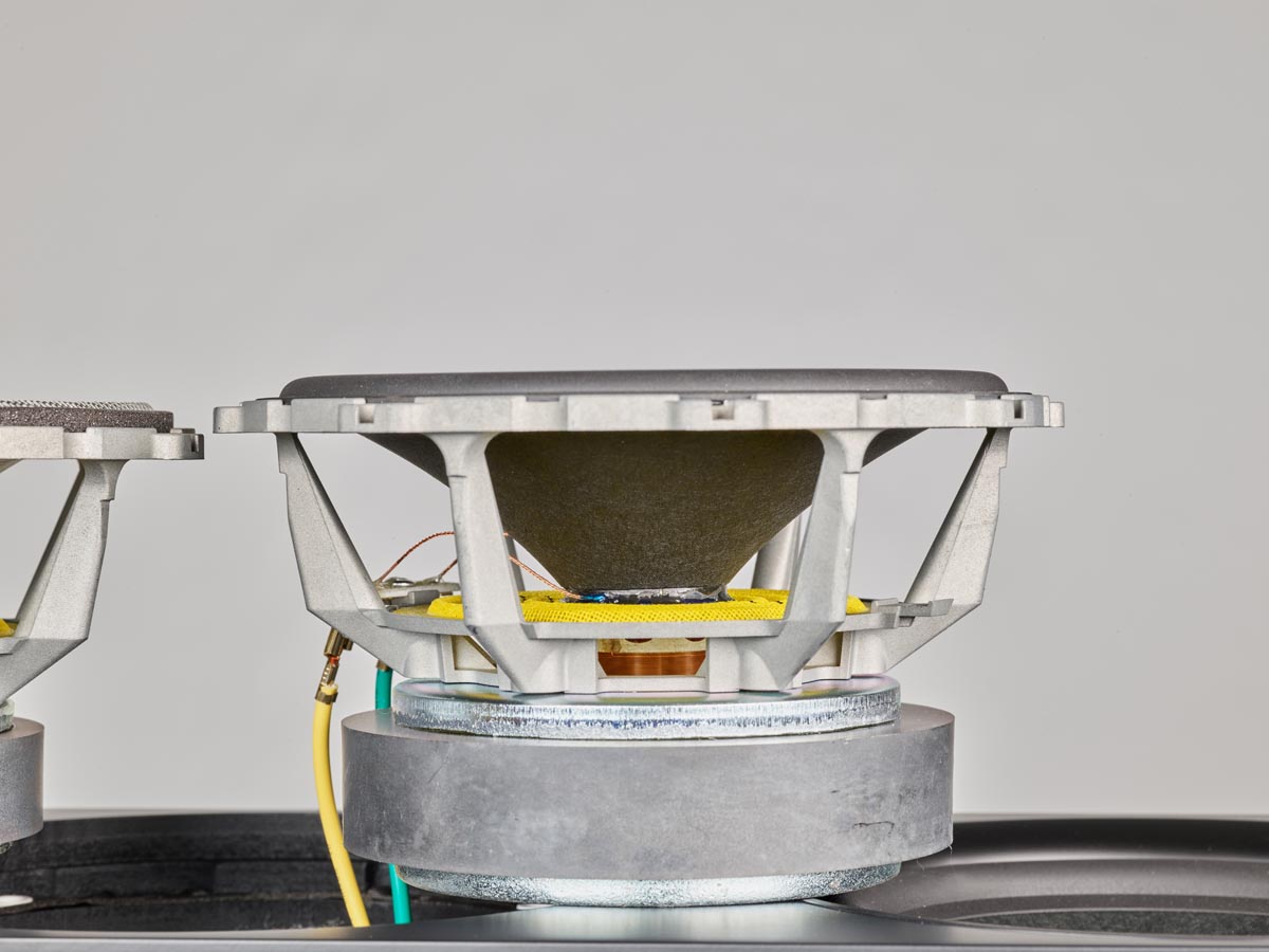 Außerdem war mir bereits nach wenigen Augenblicken vor der damals taufrischen 800 D3 klar, dass sich die Briten mit dem Membranmaterial auf ein neues Niveau begeben hatten. Es ist nachgiebiger als Kevlar, erhält durch seine gewebte Struktur aber eine hohe Steifigkeit, die es kontrollier- und berechenbar macht. Diese Kombination ermöglicht eine äußerst saubere Schallübertragung und trägt Sorge, dass der Kolbenhub an den Rändern des Mittelton-Chassis nicht in ungeordnete Verzerrungen übergeht. Der sickenlose Treiber wurde – wie zahllose Bauteile der Frequenzweiche – fast unverändert aus der 700er-Linie übernommen, er besitzt allerdings einen einfacheren Gußkorb aus Zink sowie Ferritmagneten – eine gewisse Distanz zu den großen Geschwistern muss eben gewahrt bleiben. Gegenüber der ausgemusterten 683 S2 bedeutet die abgespeckte Variante des Continuum-Treibers allerdings immer noch einen klanglichen Quantensprung.