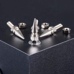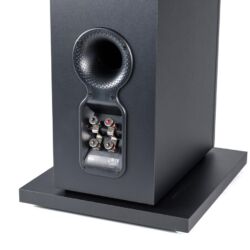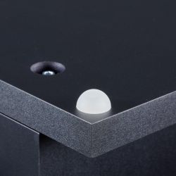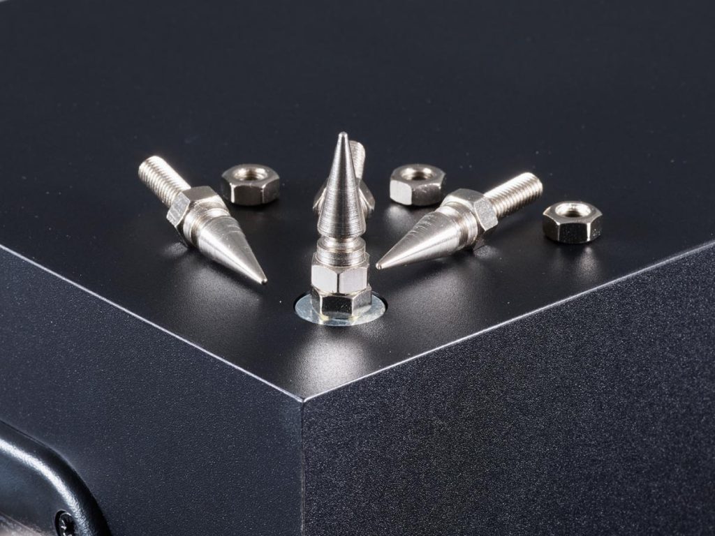 Das ist beabsichtigt, denn ehe man die Box umdreht, muss noch eine Bodenplatte montiert werden. Da die Lautsprecher knapp einen Meter hoch sind, liegen ihre Fußflächen in optimaler Arbeitshöhe. Jeweils vier dicke Schrauben drehe ich fest und verankere das Fundament damit bombenfest. Anschließend kann ich mich für eine der mitgelieferten Aufstelloptionen entscheiden: In einem kleinen Päckchen liegen Spikes sowie Gummifüße bei. Ich entscheide mich für die Gummis … vor mir liegt das Aufstellen und die räumliche Feinjustage, da kann Bewegungsfreiheit nicht schaden.
