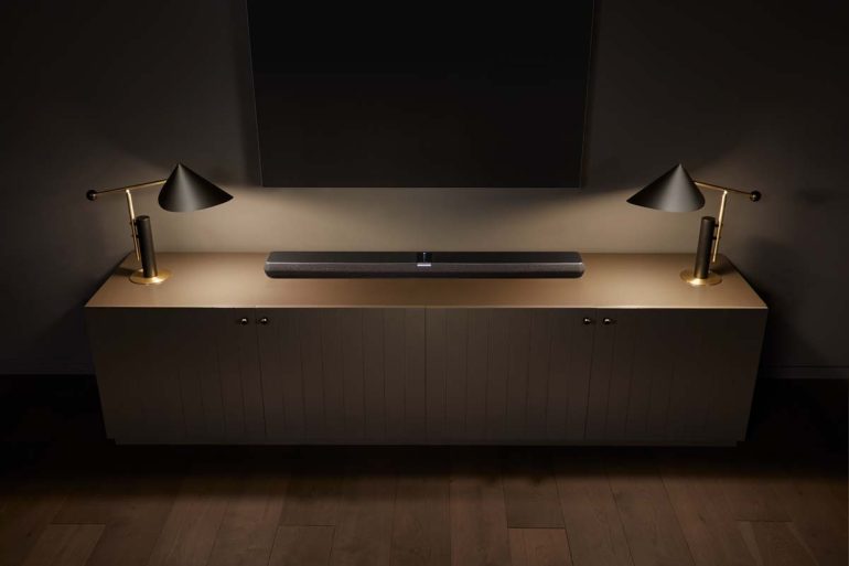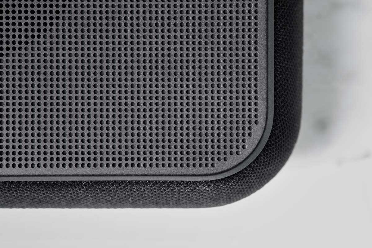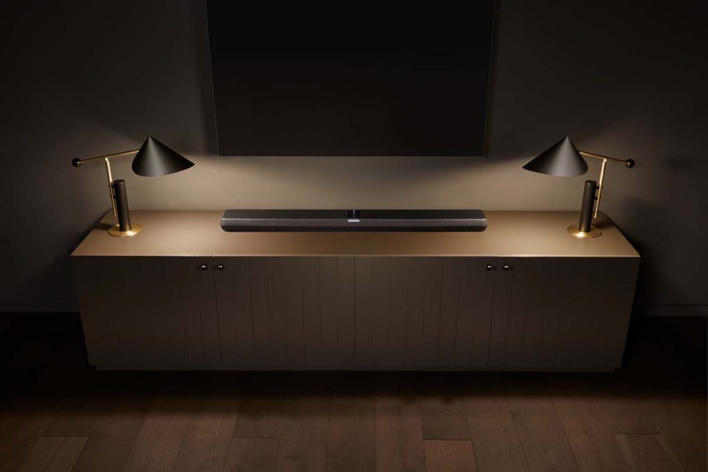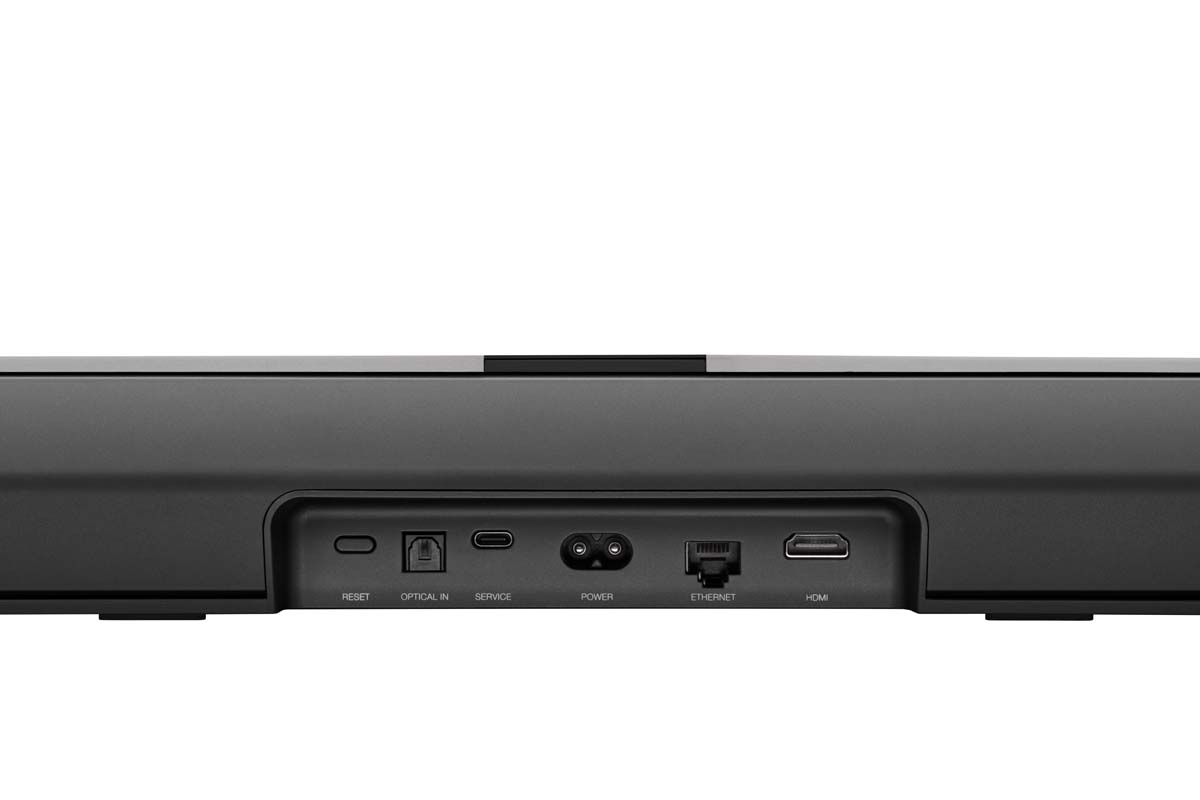 Neben den beiden nach oben abstrahlenden Dolby Atmos-Treibern verfügt die Panorama 3 links, mittig und rechts über nach vorne abstrahlende Treibereinheiten: jeweils zwei 50-mm-Mitteltöner und ein akustisch entkoppelter 19-mm-Titankalotten-Hochtöner. Zwei 100-mm-Subwoofer arbeiten in einem eigenen Gehäusevolumen, das einen großen Teil der Panorama 3 einnimmt. Dadurch erzeugen sie tiefe, weitläufige Bässe und machen den Anschluss eines externen Subwoofers überflüssig.