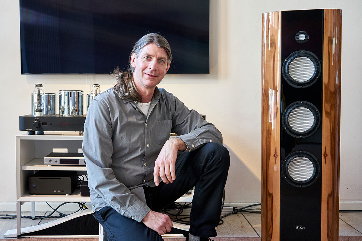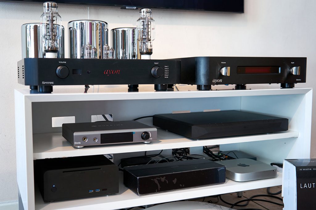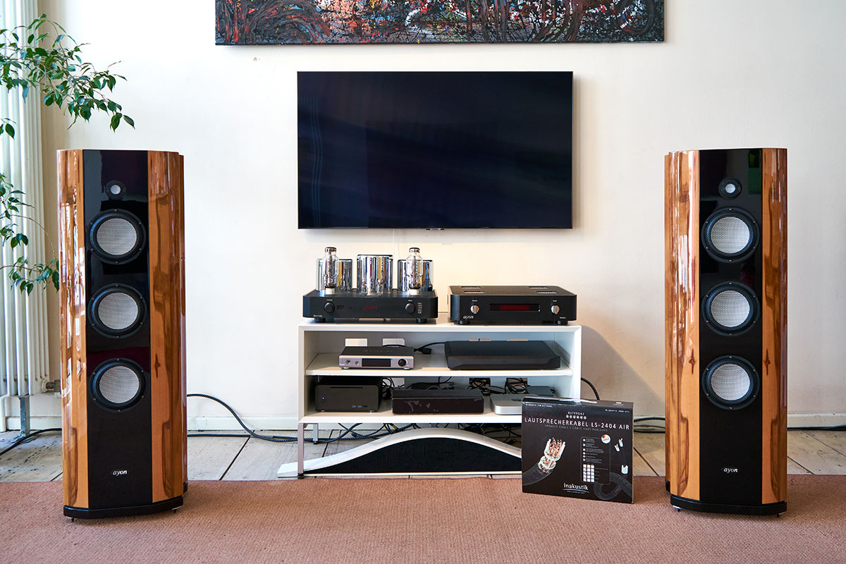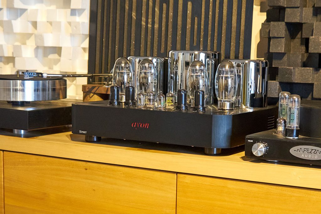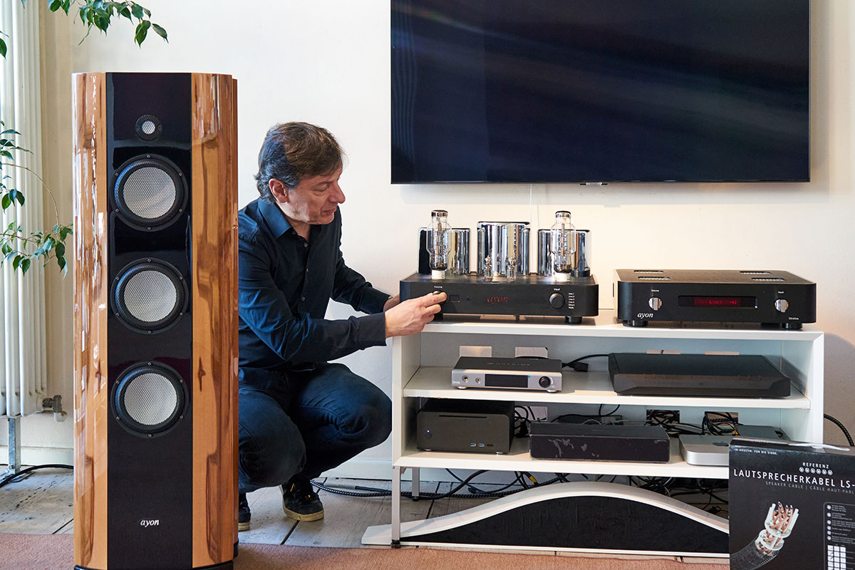 Versiert demonstriert mir Marco Amelung das Gerät. Er erläutert, dass man bemüht ist, bei Neuanschaffungen wirklich gut erhaltene Gebrauchtgeräte zu einem für den Altbesitzer fairen Preis jenseits des Preisdumpings weiterzuverkaufen. Eine Haltung, die ich äußerst sympathisch finde. Direkt neben der Platine Verdier fällt mir sofort ein Röhrenverstärker von Ayon auf. Der passt optisch wunderbar zur schwarzen Holzbasis des Laufwerks. Mit einem gewissen Stolz erläutert mir Siegfried Wörner, dass Boxen Gross nicht nur Stützpunkthändler für die Röhrenelektronik aus dem Hause Ayon ist, sondern ganz aktuell zu den einzigen drei Händlern in ganz Deutschland zählt, die für die Lautsprechersparte von Ayon Audio autorisiert sind.