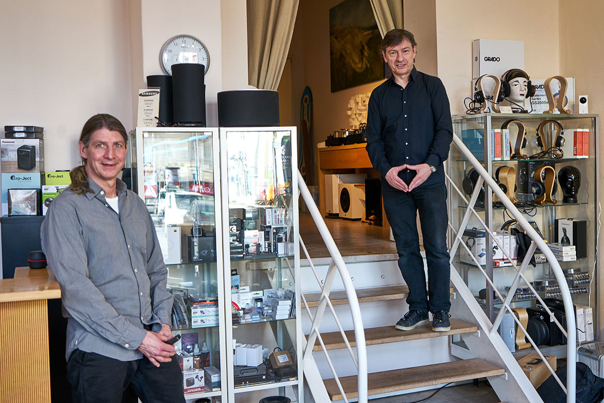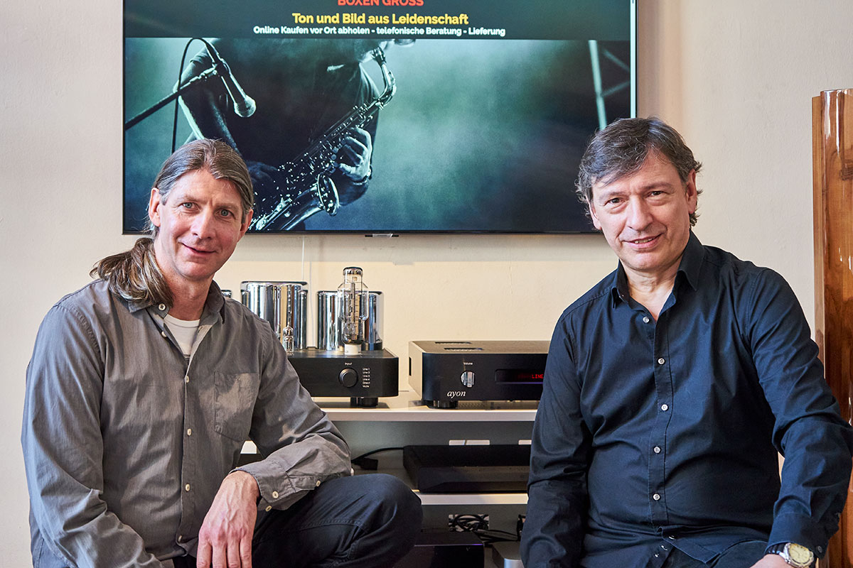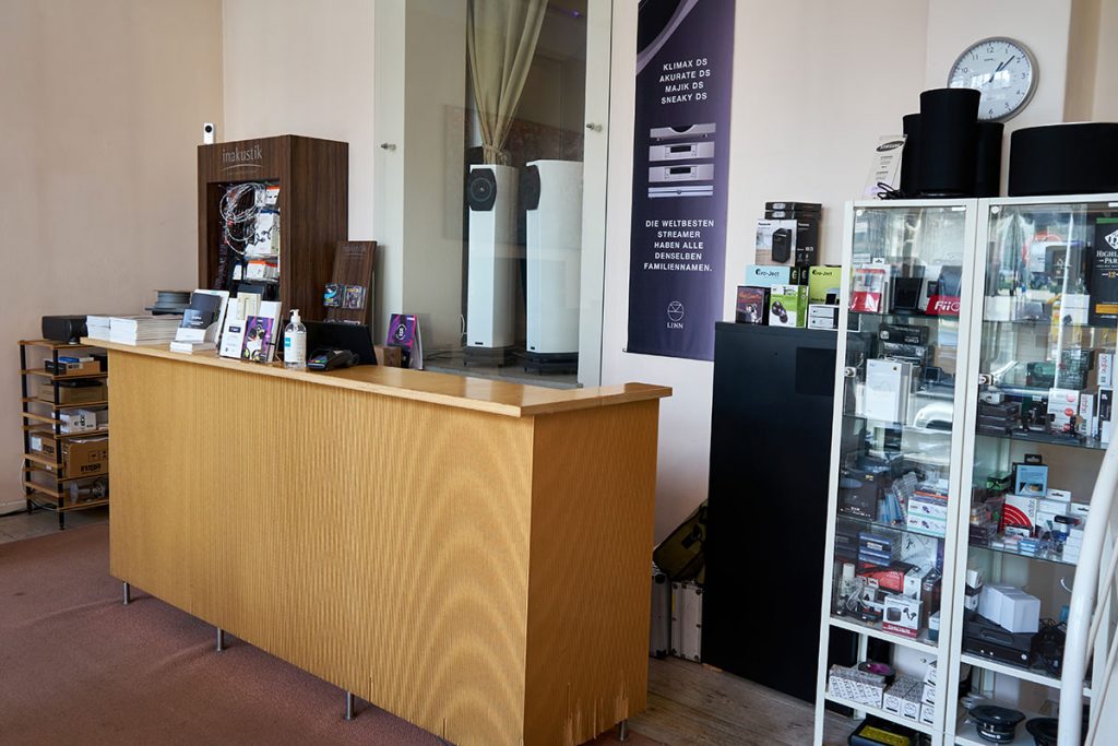 Und so betrete ich das lichtdurchflutete Foyer des Ladens von Geschäftsführer Sigfried Wörner und dessen Kompagnon Marco Amelung. Der Chef des Hauses lässt sich gleich noch einige Minuten entschuldigen, muss er doch dringend zu einem telefonischen Beratungs- und Verkaufsgespräch zurück ins Büro. Corona hat natürlich auch bei Boxen Gross einiges verändert, aber glücklicherweise nehmen die Kunden die fernmündliche Beratung dankend an und ordern anschließend online oder kommen zum Call-&-Collect-Service persönlich vorbei. Ohnehin ist, wie mir Marco Amelung berichtet, ein Einkauf bei Boxen Gross mehr als nur das schnelle Abholen eines Geräts.