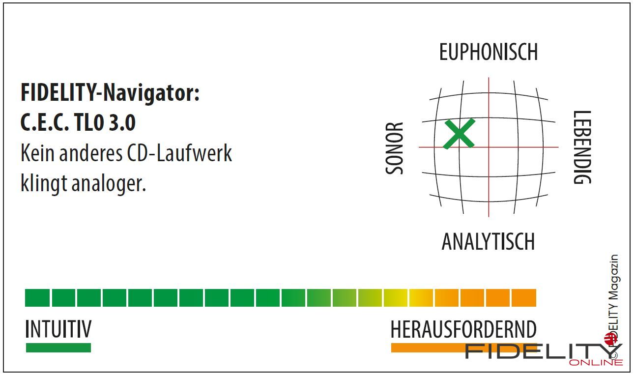 Das Topmodell von C.E.C. treibt es in puncto Analogtechnik dermaßen auf die Spitze, dass die Unterschiede zu den besten Plattenspielern völlig verschwimmen – ja, auch klanglich. Allerdings bewegt sich der Preis in jenen Stratosphären, wo sonst nur analoge Schwergewichte zu den Sternen unterwegs sind. Das TL0 3.0 bringt (mit externem Netzteil) knapp 20 Kilogramm auf die Waage, jedes einzelne Kilo kostet 1500 Euro. Das sind zusammen knapp 30 000 Euro und treibt alle „Vernünftigen“ zur Verzweiflung: Sparbrötchen jaulen auf, weil der teure Apparat nur Nullen und Einsen von Audio-CDs lesen kann und sonst nichts. Digitalverächter wenden sich ab, weil es die Technik von gestern (CD) feiert, welche die geliebte Technik von vorgestern (Schallplatte) fast verdrängt hätte. Und Trendforscher können nicht verstehen, warum irgend jemand noch Geld für eine Maschine ausgibt, die physische Tonträger abspielt. Wer hört denn bitte noch CDs?