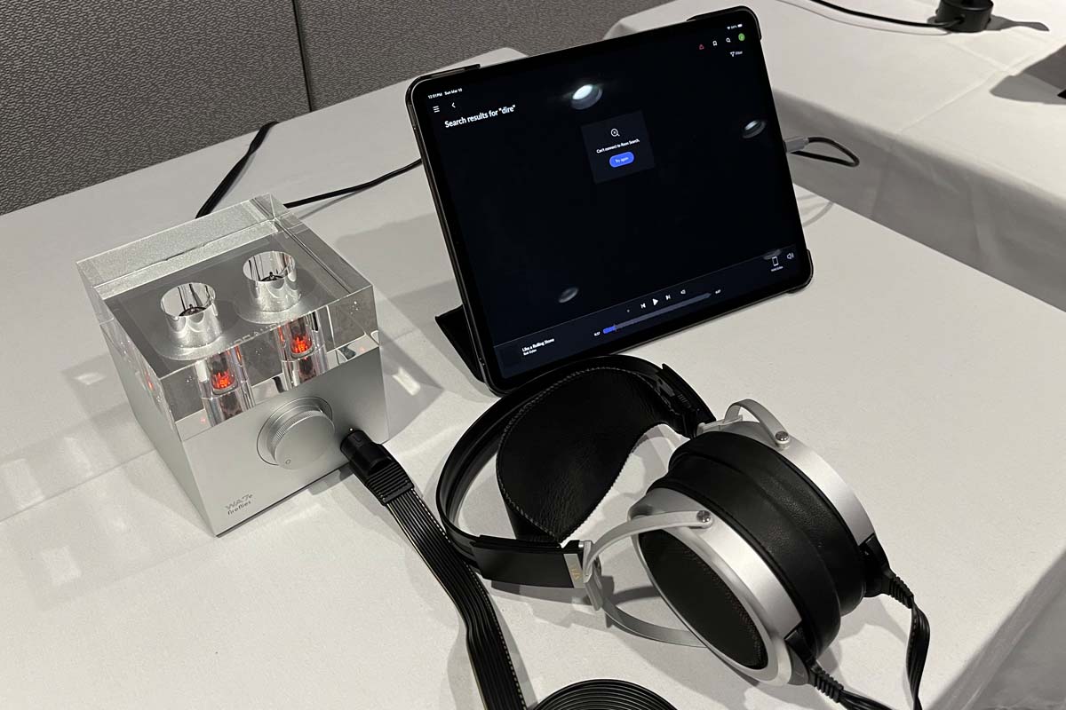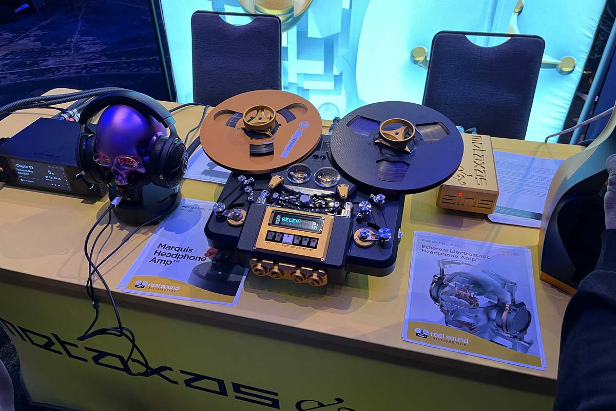 Der Klang war bemerkenswert, dank des Tourbillon-Tapedecks (49.000 $), das als Quellmaterial diente und an einen Marquis-Kopfhörerverstärker (7.000 $) angeschlossen war. Ich hörte über ZMF Caldera Magnetostaten (3.499 $). (Am Stand gab es auch elektrostatische Stax SR-X9000-Kopfhörer (6.200 $), die von einem Metaxas & Sins Ethereal-Kopfhörerverstärker/Energizer (32.000 $) betrieben wurden.