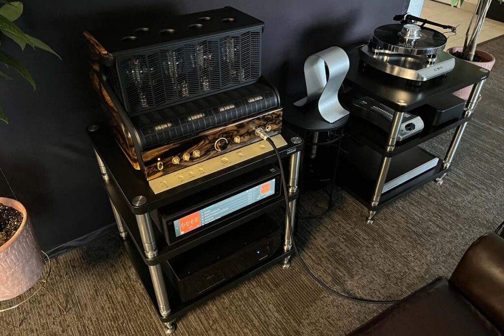 Die Ausstellung von Metaxas & Sins war sowohl visuell als auch klanglich bemerkenswert beeindruckend. Kostas Metaxas hat eine einzigartige Design-Sensibilität, die Steampunk, Futurismus, Art Deco und andere weniger kategorisierbare Elemente zu etwas ganz Eigenem verschmilzt. Sein Ethereal-Kopfhörerverstärkersystem sieht aus wie ein Roboterkopf und -torso mit kantigen Ausschnitten, doch das Design ist funktional – die Ausschnitte dienen als Kühlkörper. (Ich überlasse es Ihnen zu raten, wo sich die beiden Lautstärkeregler befinden.)
