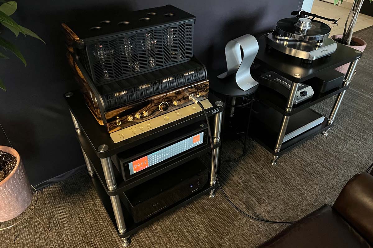 Der in Los Angeles, Kalifornien, ansässige Händler High End by Oz hatte eine ganze Reihe verlockender Geräte im Angebot, und da ich ein Mann mit einem raffinierten und teuren Geschmack bin (vor allem, wenn es um Dinge geht, die ich mir nicht leisten, wohl aber auf Messen genießen kann), entschied ich mich für den italienisch-lettischen Kopfhörerverstärker VIVA Egoista 2A3 ($15.500), der, wie Sie sich denken können, mit 2A3-Ausgangsröhren ausgestattet ist. Ich setzte mir Meze Audio Elite-Kopfhörer ($3.999) auf, legte “Ipanema” auf (das zu diesem Zeitpunkt der Show zu einem meiner Referenz-Hörstücke geworden war) und sonnte mich in dem warmen, süßen, üppigen Klang. Die Abbildung war hervorragend – über diese Kopfhörer konnte man klar ausmachen, dass der akustische Bass im linken Kanal zu Hause war, was sich durch andere Systeme nicht erschloss. Für mich ist das genau die Art Klang, um die es bei High-End-Audio geht – ein wunderbares Klangserlebnis, das einen eintauchen und immer und immer weiterhören lässt.