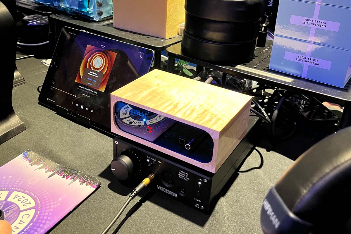 ABYSS war ein weiteres Unternehmen, das Tonbänder als Quellmaterial verwendete, in diesem Fall über ein Technics RP Series Deck mit einem RP-2422 Headblock. Die Bänder waren Master der ersten Generation, die jemand von Atlantic Records und anderen Labels erworben hatte. Ich hörte sie über den ABYSS AB1266 Phi TC, einen 6.000-Dollar-Kopfhörer mit magnetostatischen Treibern, der über ein hauseigenes offenes Design verfügt. Als ich den Kopfhörer aufsetzte, lief gerade “The Girl From Ipanema” von Getz/Gilberto, und…wow. Zufälligerweise hatte ich gerade die Neuauflage von Impex Records rezensiert (Artikel in Copper 205), so dass die Aufnahme noch frisch in meinem Gedächtnis war. Der Klang war sehr klar, ausgewogen und natürlich, wobei die Nuancen des Schlagzeugs besonders fein wiedergegeben wurden. Das Saxophon von Stan Getz hatte Körper und Persönlichkeit, wenn auch auf eine ganz andere Weise als beim Hören über Lautsprecher. Ein Genuss.