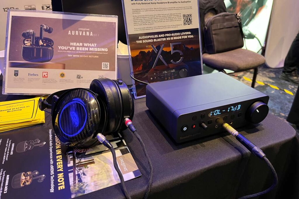 Creative Labs ist, wie viele von uns wissen, ein führender Hersteller von Gaming-Hardware, Computer-Soundkarten, Lautsprechern und Kopfhörern. Entsprechend neugierig wurde ich, als ich sah, dass sie den kabellosen In-Ear-Kopfhörer Aurvana Ace 2 (129,99 $) anbieten – der mit xMEMS-Hochtönern und dynamischen Tieftönern arbeitet. Modernste Treibertechnologie von einem Mainstream-Unternehmen? Dürfen Sie ruhig glauben. Selbst für jemanden wie mich, der mit hohen Frequenzen nicht zurechtkommt, war die Transparenz und Auflösung des Ace 2 offensichtlich. xMEMS-Treiber verwenden einen piezoelektrischen Motor und eine Siliziummembran anstelle der herkömmlichen Schwingspulen und Materialien, die bei Kopfhörern mit dynamischen Treibern oder symmetrischen Ankern verwendet werden. Creative Labs zeigte außerdem den vollsymmetrischen “Kopfhörer-Bi-Verstärker für Audiophile” namens X5 (239,95 $), der eine PCM-Wiedergabe mit bis zu 32 Bit/384 kHz ermöglicht.