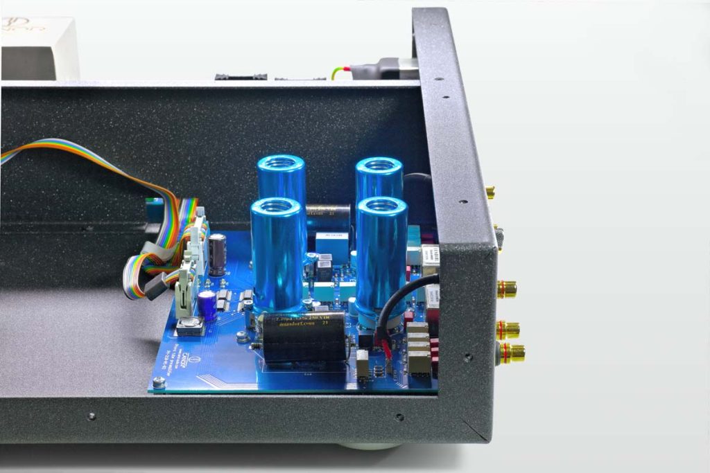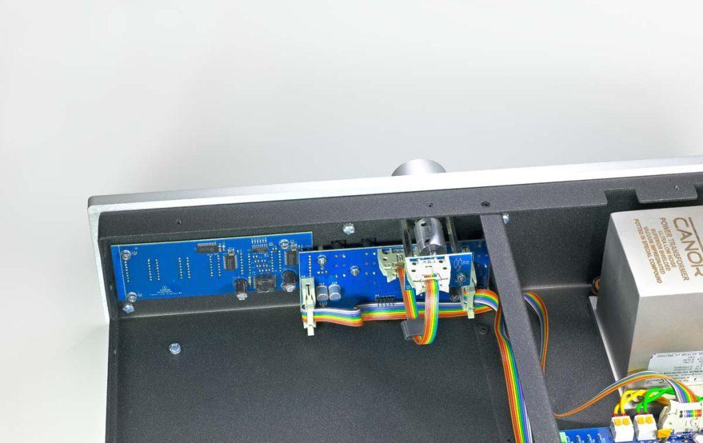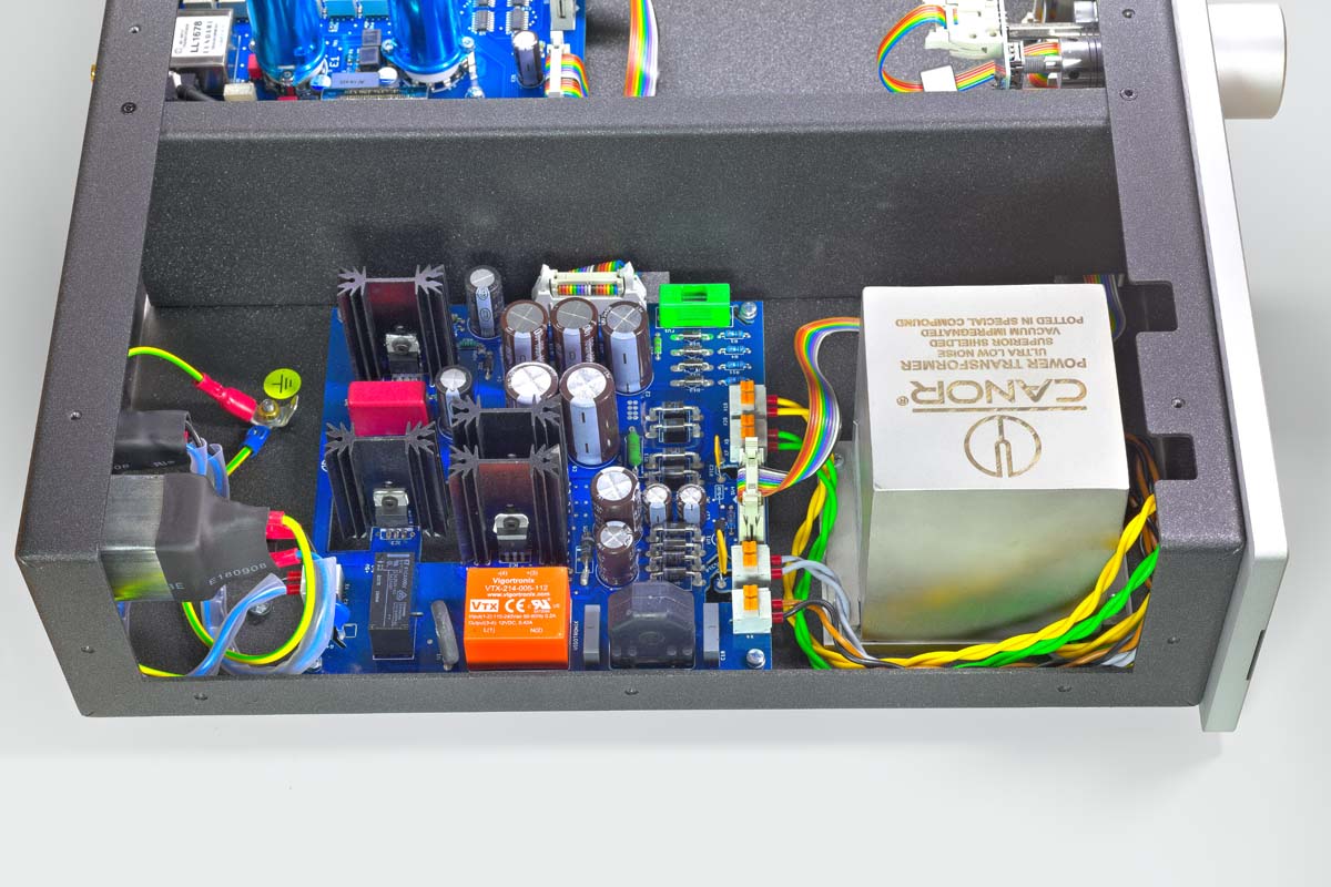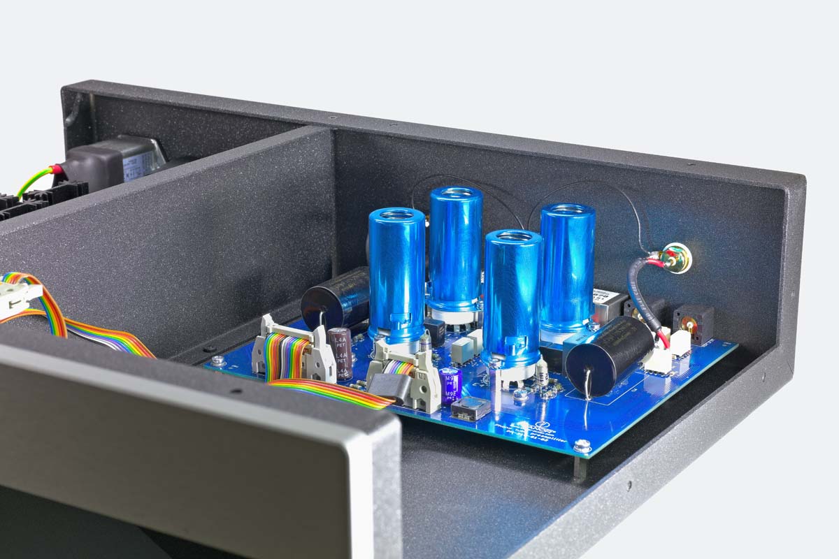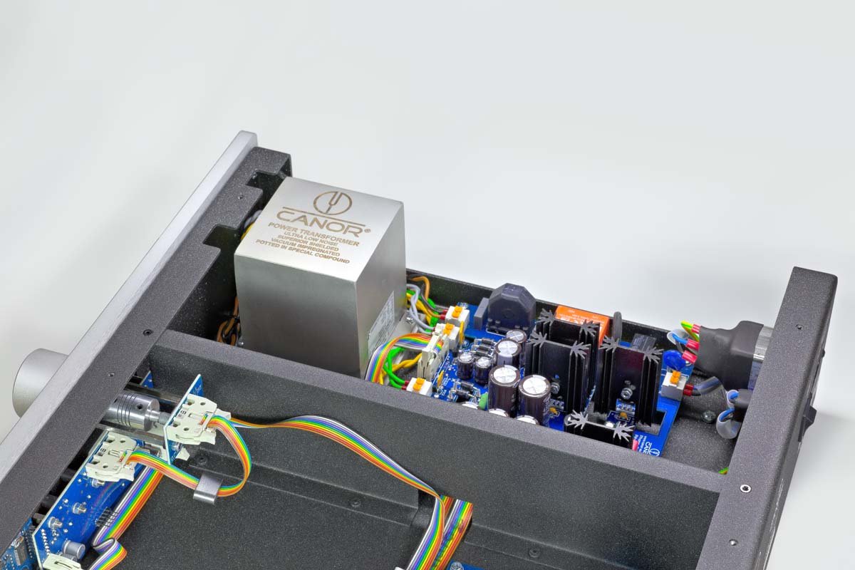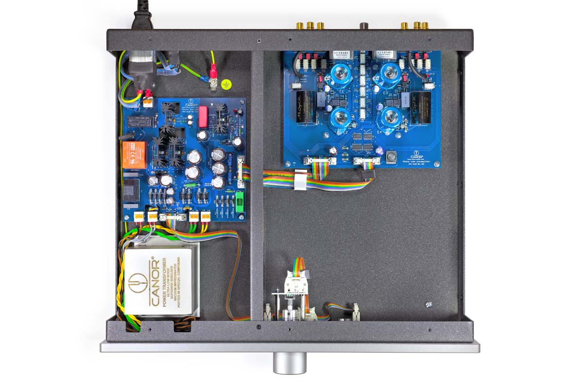 Ein Blick ins Gehäuse offenbart, dass es dort sehr aufgeräumt und beinahe luftig zugeht. Ein Stahlblech gliedert das Innere in zwei Sektionen, die Bauteile sind so maximal voneinander isoliert. In der einen Hälfte residiert die Spannungsversorgung und der Ringkerntransformator mit seinem vakuumimprägnierten Kern. Die andere Hälfte beherbergt die Röhren-Verstärkerstufen. Die MC-Signale werden mithilfe eines Step-up-Transformers von Lundahl auf die erforderliche Spannung der MM-Verstärkerstufe hochtransformiert. Per Relais werden die Abschlusswiderstände zugeschaltet und können recht feinfühlig auf den gewünschten MC-Tonabnehmer angepasst werden. In der MM-Verstärkerstufe erfolgt die Signalverstärkung mit jeweils zwei Doppeltrioden 12AX7 und 12AT7. Das verspricht eine effiziente und möglichst rauschfreie Signalaufbereitung und soll insbesondere dem Klang zugutekommen. Die Röhren werden vorab bei Canor in einem aufwendigen Messverfahren mittels eines selbst entwickelten Messsystems namens „Aladdin“ vermessen, katalogisiert und für die jeweiligen Geräte ausgewählt, damit ein möglichst optimaler Betriebspunkt gewährleistet ist. Blaue Metallhütchen mit Federn, die sanft auf die Röhren drücken, sollen Mikrofonie-Effekte unterdrücken. Der Canor arbeitet dabei ohne Über-alles-Gegenkopplung mit einer rein passiven RIAA-Entzerrung. Bei der Platinenbestückung und sogar beim Layout verwendet Canor eigene Verfahren, zum Beispiel die sogenannte CMT-Technologie. Dabei werden Platinenbereiche um die Leiterbahnen weggefräst, um Blindverluste in der Signalübertragung zu minimieren. Insgesamt ist die Konzeption des Canor PH 2.10 also auf hohe Störungsarmut und verlustfreie Signalverstärkung ausgelegt. Wesentliche Punkte sind hier das stabile Gehäuse, ein vibrationsarmer Transformator, die hochwertigen Bauteile in einem aufwendigen Platinen-Layout und nicht zuletzt die damit optimalen Randbedingungen für eine möglichst klangstarke Röhren-Vorverstärkerstufe.