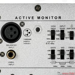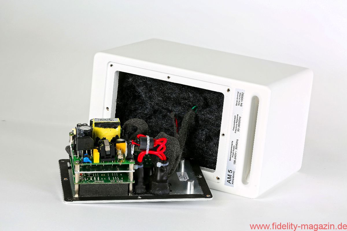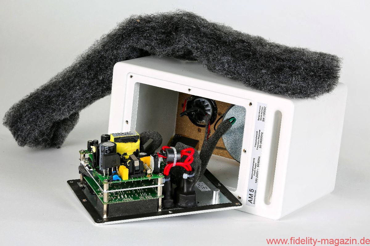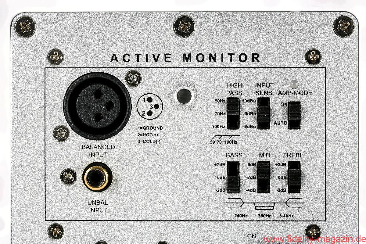 Ein Blick auf seine Rückseite macht allerdings schnell klar, wo mit dem AM 5 die Musik in erster Linie spielen soll – nämlich in kleinen Projekt- oder Tonstudios. Neben einem symmetrischen XLR-Analogeingang (genau so gehört sich das – alternativ gibt’s aber auch eine unsymmetrische RCA-Buchse) finden sich ein halbes Dutzend Schiebeschalter, die ein vielfältiges Anpassen ans akustische und elektrische Umfeld ermöglichen. Neben der Bass- und Hochtonkompensation ist dabei ein Schalter besonders erwähnenswert, mit dem sich auch die unteren Mitten im Bereich zwischen etwa 200 und 500 Hertz um bis zu 4 Dezibel absenken lassen: Damit wird der akustische Einfluss von Grenzflächen nahe dem Lautsprecher, beispielsweise die Tischplatte oder das Mischpult, kompensiert. Auf dieses wichtige Feature einer vollständigen akustischen Ortsanpassung verzichten leider die meisten von HiFi-Herstellern stammenden Nahfeld-Monitore.