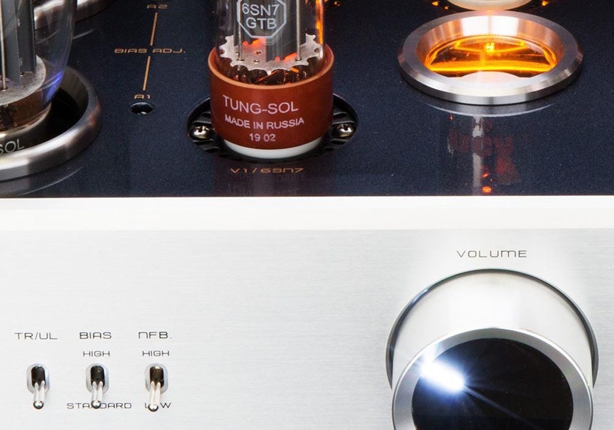 Drei Schalter ermöglichen die klangliche Abstimmung nach Ihrem individuellen Geschmack respektive die Anpassung an Ihre Lautsprecher. Dazu zählt eine Umschaltung zwischen Trioden- und Ultralinear-Betrieb. So haben Sie die Wahl zwischen zarten, detailreichen Harmonien, flüssiger und holographischer Wiedergabe, die ideal für Stimmen und Streichinstrumente ist. Oder Sie steigern im Ultralinear-Betrieb die Leistung und Dynamik mit kontrollierter Basswiedergabe. Die Ausgangsleistung beträgt stramme 2 x 55 Watt Sinus im Trioden-Modus und steigt im Ultralinear-Modus auf bemerkenswerte 2 x 100 Watt an. Das ist eine extreme Leistungsausbeute für einen reinrassigen Röhrenverstärker.