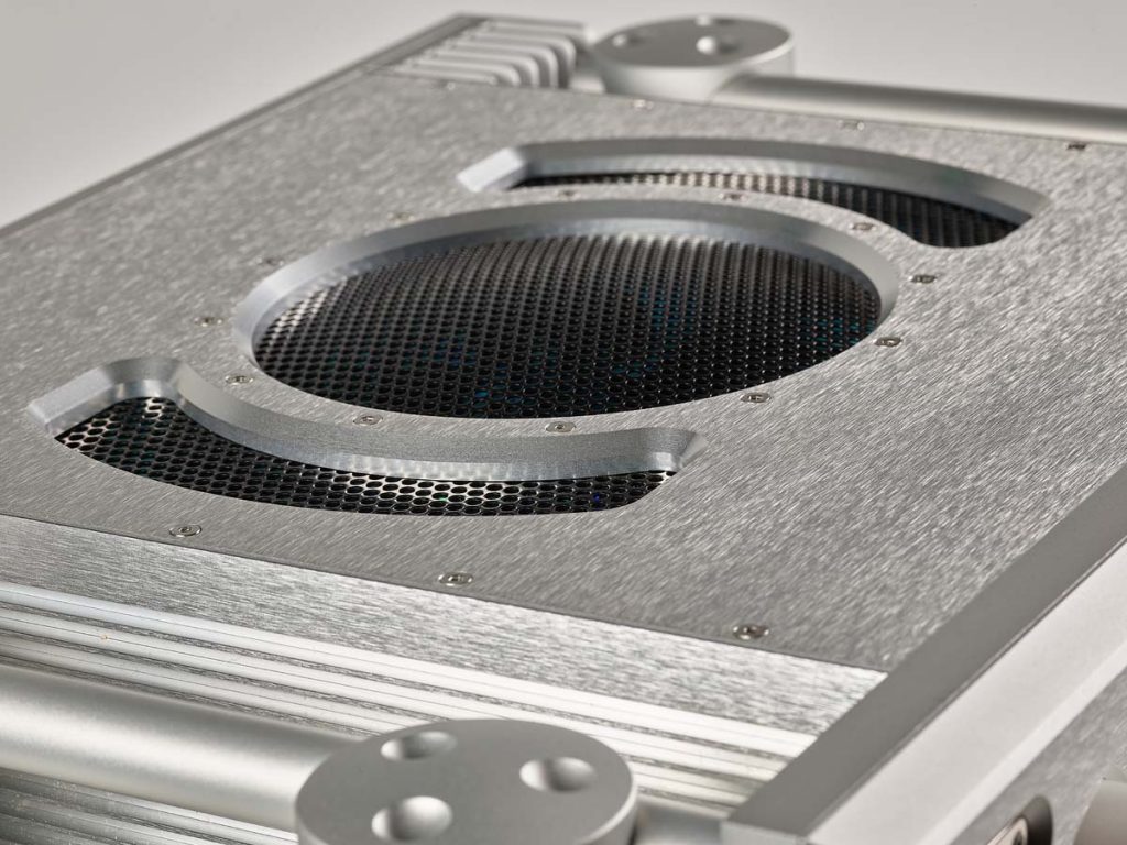 Ausführungen: massives Aluminiumgehäuse in Nachtschwarz oder Silber eloxiert, schwarze Seitenteile optional