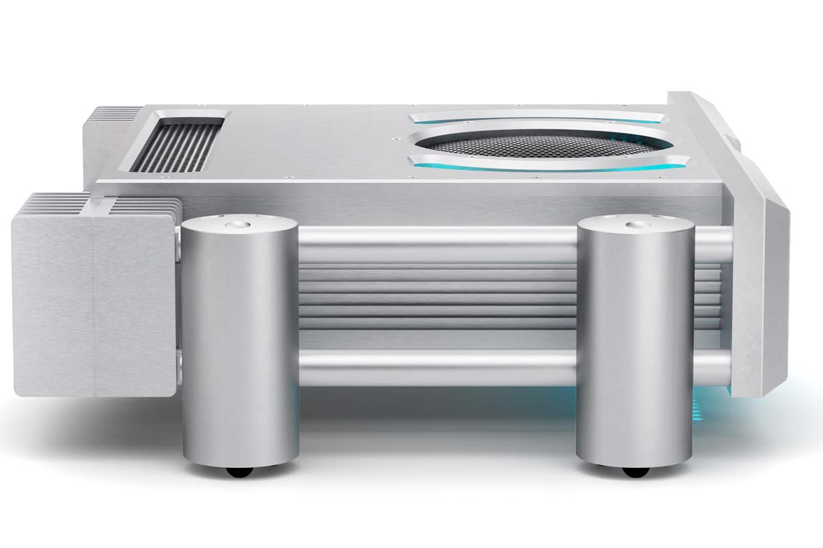 Das Design des Ultima Integrated unverwechselbar zu nennen, ist eine grobe Untertreibung. Hinter seiner 42 Zentimeter breiten Frontplatte steckt eine nur 30 Zentimeter schmale Technikbehausung. Der 28 Millimeter dicken Front nehmen breite Fasen, strategisch platzierte Kerben und eine plastische Ausarbeitung mit tief versenkten, organisch geformten Drehknöpfen gekonnt die Wucht. Die acht Millimeter dicke Topplatte ist großzügig durchbrochen, die Öffnungen sind mit Lochblechen verschlossen. So ergeben sich betriebssichere Einblicke in den Maschinenraum. Vier 55 Millimeter durchmessende freistehende Aluminiumzylinder bilden die Füße des Integrierten. Diese sogenannten Integra Legs sind mit dicken Streben verbunden, die das Gerät zweifellos zum handlichsten High-End-Amp aller Zeiten machen. Man kann sich den Verstärker auch mit schnöden kastenförmigen Seitenteilen bestellen, aber welcher Banause würde so etwas bitteschön tun?