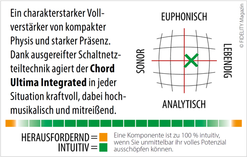 Ich höre eine nagelneue Produktion des klanglich immer an vorderster Front agierenden Klassiklabels Genuin: UKAI, ein Statement in zeitgenössischem Blockflötenspiel. Die Musikerin heißt Susanne Fröhlich, ihre Kunst verschiebt Maßstäbe, und wer diese CD nicht gehört hat, der ist zu bedauern. Man sollte die Stücke über die beste Anlage hören, die nur irgendwie greifbar ist, denn die dynamische Bandbreite ist rekordverdächtig. Bei den von klassischem japanischem Flötenspiel ausgehenden Stücken sorgt der Chord für warme, emotionsgeladene Klangfarben und nie abreißende Spannung. Der Kracher ist Track 6: ein Duo von Blockflöte mit einem elektronisch bespielten Lautsprecher. Die dynamischen Spitzen bringen die Anlage an ihre Grenzen, Subbass trifft Ultraschall, mittendrin eine synthetische Klangfigur, die sich horizontal im Kreis zu drehen scheint. Spektakulär. Und über den Chord der reine Genuss. Ja, er gefällt mir. Immer mehr, je länger er dasteht. Ich habe mich auf die ästhetische Herausforderung eingelassen – und wurde nicht enttäuscht. Mit seinem wunderbar reduzierten, analog-puristischen Auftritt und audiophilen Qualitäten, die schlicht Weltklasse sind, sollten ihn alle ernsthaft in Betracht ziehen, die von raumgreifenden getrennten Verstärkerkombis downsizen wollen, ebenso wie jene, die wissen wollen, was mit Integrierten möglich ist, ohne Schwerlastpodeste aufzubauen. Ein sehr feines Maschinchen, und in dem Format vielleicht tatsächlich: ultimativ.