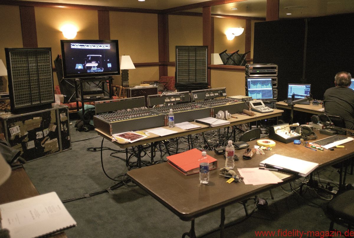 Zur Demonstration gehen wir in einen der Masteringräume: kreatives Chaos („die besten Diffusoren“), eine Workstation und genannte Quad ESL 63. Wir hören Ausschnitte aus der 8. Sinfonie von Gustav Mahler mit dem San Francisco Symphony Orchestra unter Michael Tilson Thomas. Unkomprimierte 60 Dezibel Dynamikumfang brechen über mich herein. Zur Verdeutlichung, was das auch bedeuten kann: In einem wirklich leisen Zimmer liegt der Grundgeräuschpegel mit etwas Glück bei 50dB, und eine Kettensäge bringt es in einem Meter Abstand auf 110dB. Zu Hause wird es – tut mir leid – nur den allerwenigsten von uns möglich sein, einen solchen Dynamikumfang darzustellen.