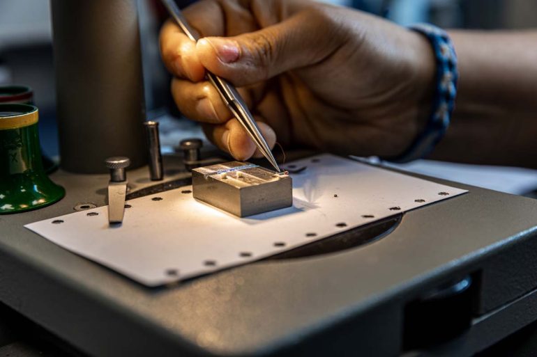 Danach ging es zur zweiten Station, wo ich lernte, dass je zwei mikroskopisch kleine Spulen, getrennt durch eine kleine Isolation, ans Ende eines Nadelträgers geklebt werden – und das ist noch der einfache Teil. Denn genau hier lag mein ursprüngliches Interesse: Wie lässt sich eine derart filigrane Handarbeit mit Messwerten vereinbaren, die mehrere Nachkommastellen erfassen? Schließlich muss jeder Nadelträger das gleiche Niveau erreichen. Und die Latte liegt hoch: An den Tischen, an denen wir den Workshop abhielten, entstehen Abtaster wie ein Da Vinci V2, Titanium V2 oder Goldfinger Statement. Hier liege der eigentliche Kniff, wie mir eine erfahrene Mitarbeiterin erklärte. Nach der ersten Montage werden die Nadelträger mit Lupe und Mikroskop geprüft, korrigiert und mit reichlich Fingerspitzengefühl nachgebogen, bis sie absolut gerade und gleichmäßig sind. Nur die exaktesten der Exakten schaffen den Weg in die Top-Pickups des Unternehmens. Die immer noch sehr guten Träger wandern in die „kleineren“ Modelle wie den Talisman. Der Rest kommt … in die Wiederverwertung. Genau hier liege der entscheidende Unterschied zwischen den Einsteiger-, Mittelklasse- und Top-Abtastern der Erlangener: Selektion.