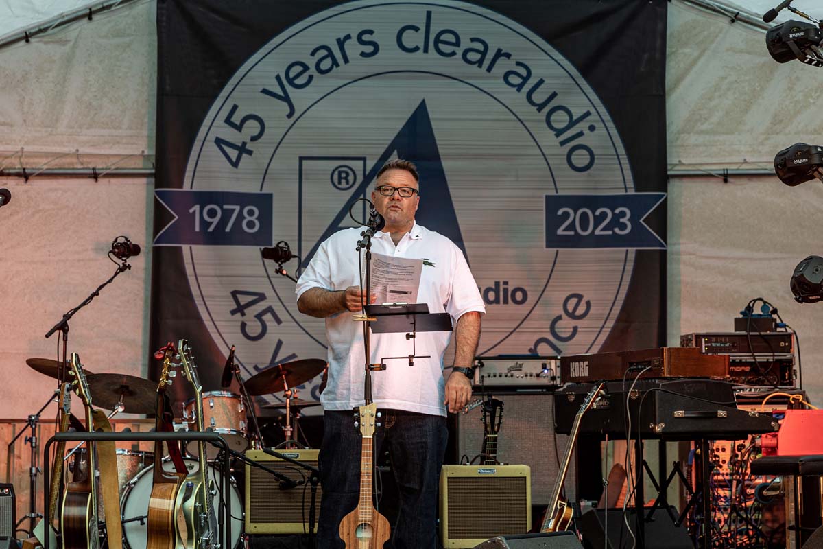 Eigentlich hatten wir uns auf eine lockere Party eingerichtet. Dass Arbeit auf dem Plan stand, hatten uns die Geschwister Veronika und Robert Suchy nicht angekündigt, als sie zum 45er-Jubiläum ihres Unternehmens einluden. Der Tag war gespickt mit Events und Aktivitäten – von emotionalen Ansprachen über Werksbesichtigungen, Workshops (mit besagtem Anpacken) und einem Gewinnspiel. Zum Finale gab’s Spanferkel und Livemusik von Wolfgang Bernreuther. Für das „kleine“ Jubiläum hatten sich die Erlangener einen ziemlich raffinierten Termin ausgesucht: Zwei Tage vor der HIGH END 2023 hatten selbst Vertriebe und Händler aus fernen Ländern keine Ausrede für den Weg nach Franken. Entsprechend voll war es nun hier, und entsprechend farbenfroh und gut gelaunt ging es auf dem Gelände rund um das Clearaudio-Werk zu.