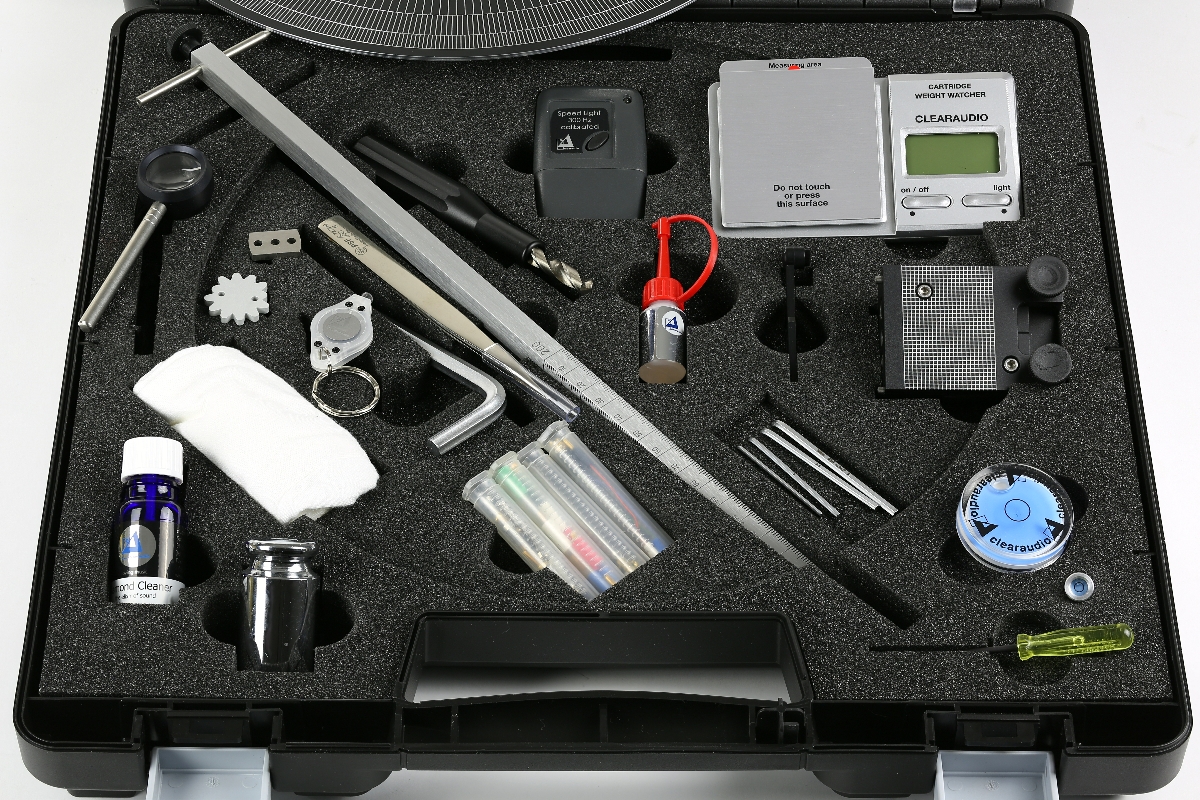 Völlig klar, dass ein solches Rundum-glücklich-Paket für Analogprofis und solche, die es werden wollen, mit ordentlichem Besteck bestückt ist und daher auch ein angemessenes Sümmchen kosten muss. Ich jedenfalls halte die aufgerufene Summe für eine derartig hochwertige Sammlung an Qualitätswerkzeug für absolut gerechtfertigt. Allein für die universelle Einstelllehre samt dazugehöriger Messplatte und die Präzisionswaage sind sonst schon ein paar sehr große Scheine fällig– und nicht vergessen: Der Spezialkoffer mit dem ausgefuchsten Innenleben ist ja an sich auch ein Werkzeug. Hinter seiner transparenten und verriegelbaren Klappe im Deckel ist übrigens noch genug Platz, um neben der dort serienmäßig untergebrachten „Trackability Test Record“ auch noch den einen oder anderen eigenen Vinyl-Favoriten zu verstauen.